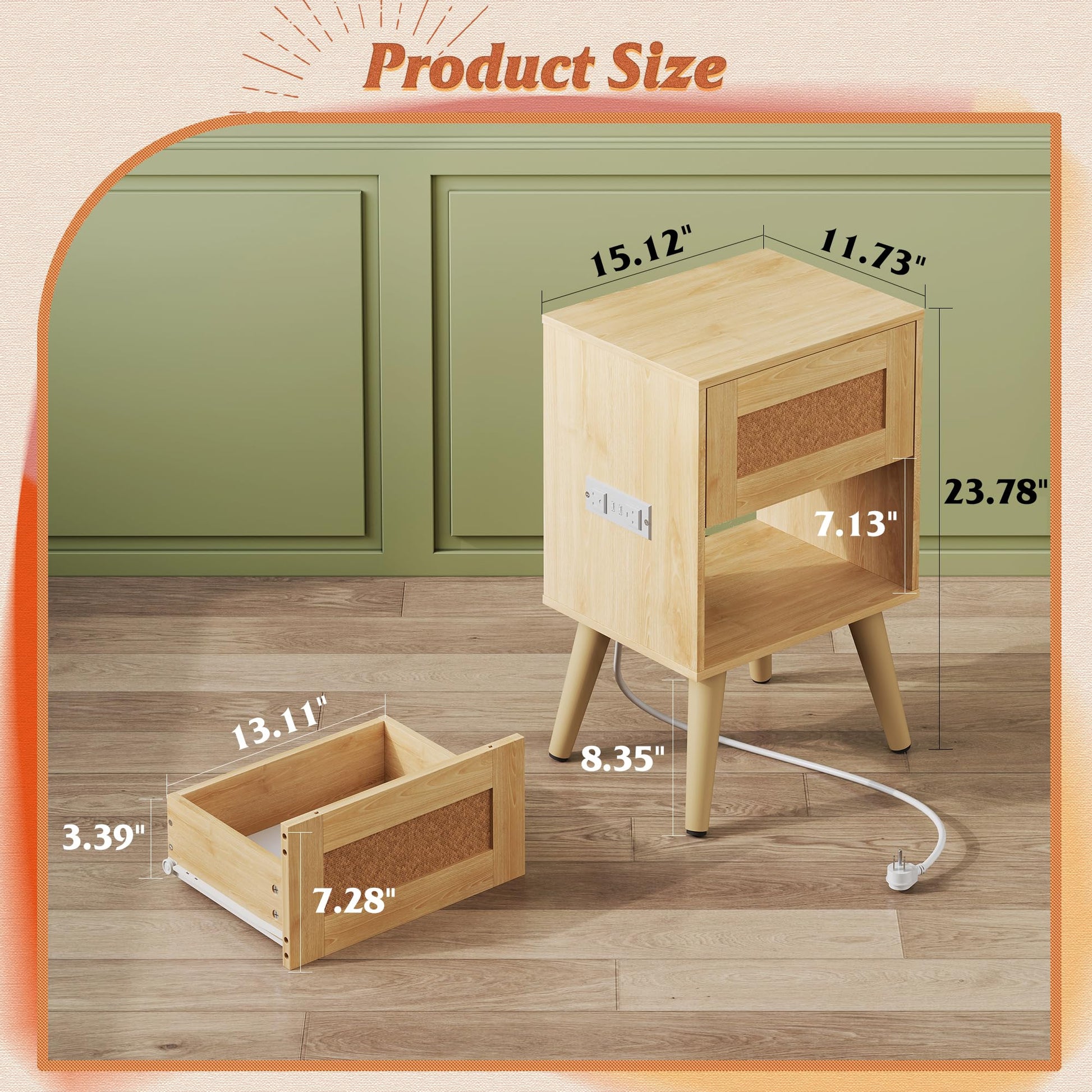 WLIVE Rattan Nightstand with Charging Station, Boho Night Stand, Small Bedroom Side Table, End Table with Drawer and Storage, Wood Bedside Tables for Bedroom, Small Spaces, Natural Oak