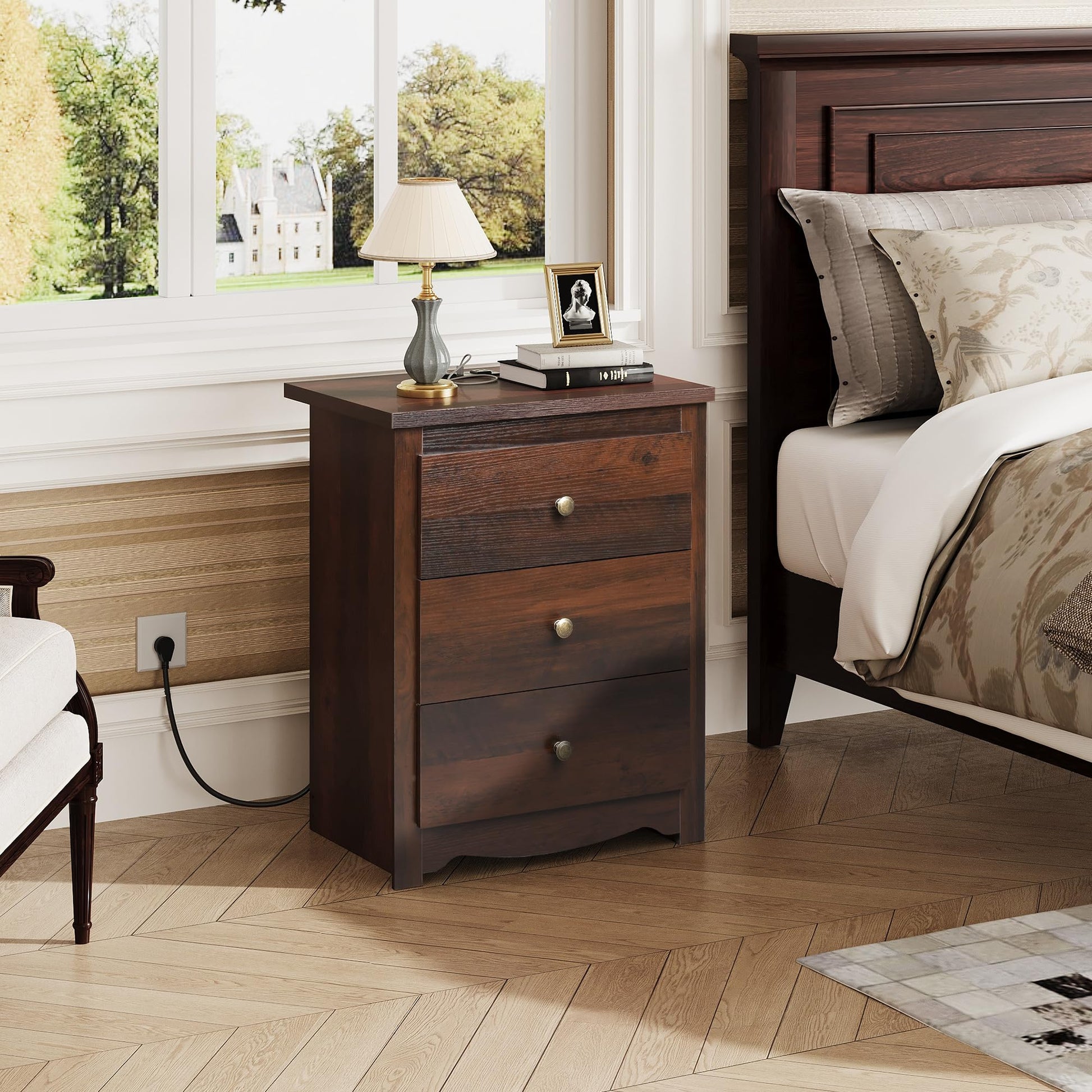 WLIVE Tall Nightstand with Charging Station, Wood Nightstand with 3 Drawers, Bedside Tables Bedroom, Dorm, End Table with 2 USB Ports and 2 AC Outlets, Bedside Table, Espresso