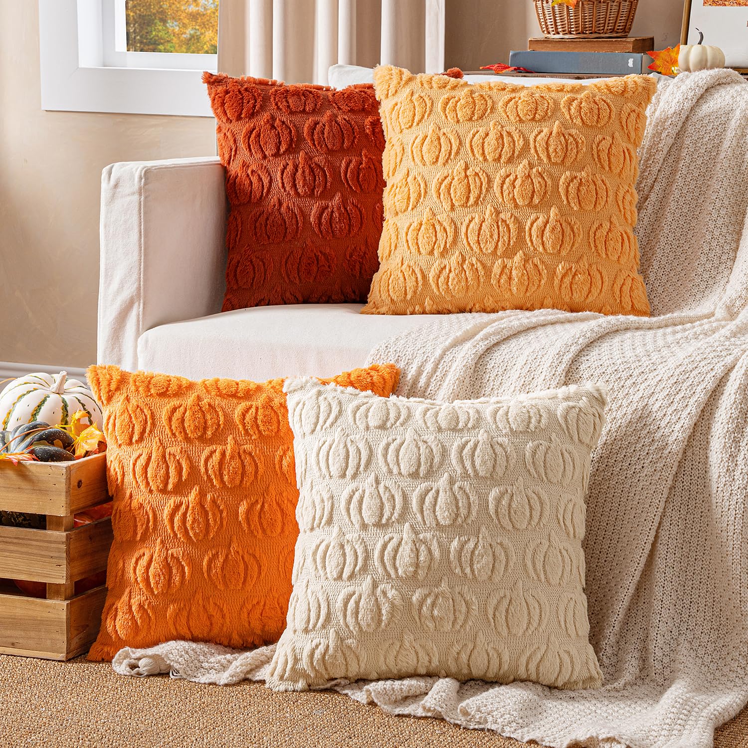 Woaboy Fall Pumpkin Pillow Covers Soft Cozy Plush 18x18 Inch Set of 4 Decorative Pillows Autumn Halloween Holiday Home Decor for Sofa Couch Porch Bed Living Room,Rust-Beige-2