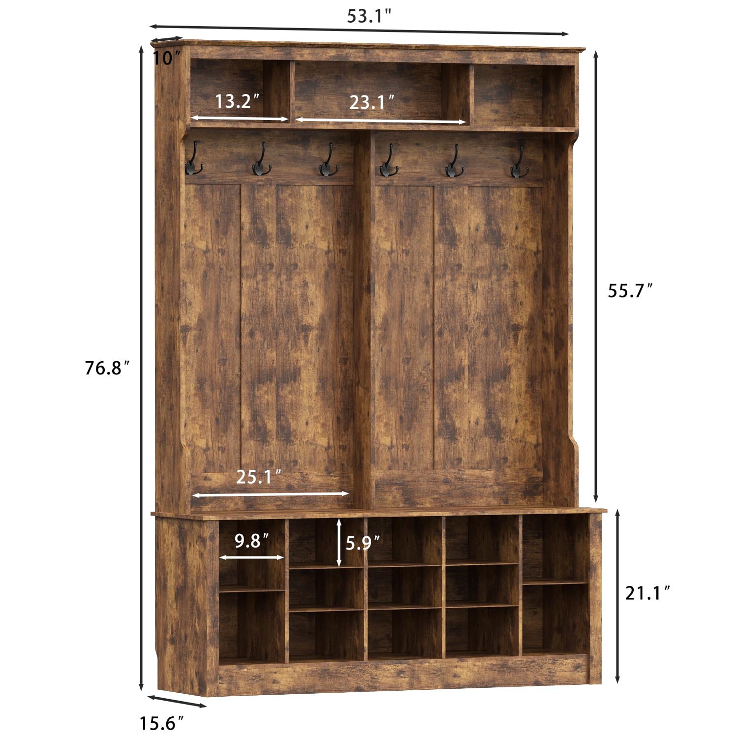 Wodeer Entryway Hall Tree with Bench and Shoe Storage, 53" Farmhouse 4-in-1 Mudroom Storage Organizer with Coat Rack, 6 Double Hooks, 12 Shoe Cubbies, Adjustable Shelf, for Hallway, Bedroom, Brown