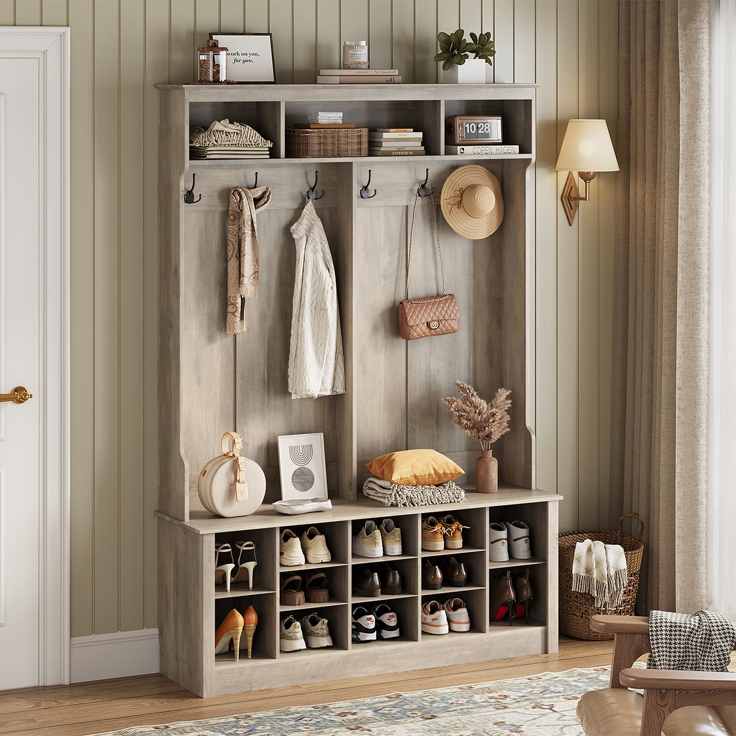 - 【4-in-1 Farmhouse Hall Tree】This hall tree with bench and shoe storage combines a coat rack, shoe bench, 12 cubbies, and 3 top shelves for complete entryway and mudroom organization. The 6 double hooks hold coats, scarves, and bags, while the bench provides a comfortable spot for putting on shoes.