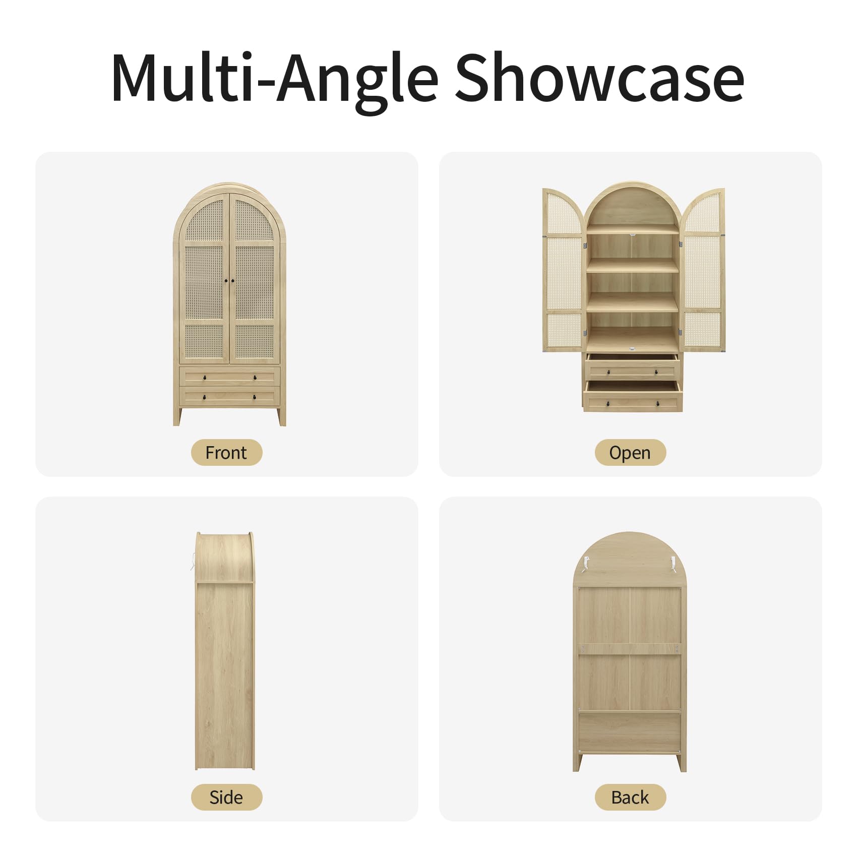 - Elegant Arched Design: With its sophisticated, elegant arched design, this wood pantry cabinet brings a touch of refinement to your home. The hollowed rattan doors paired with sleek black tapered metal handles create a stylish, contemporary look that fits in any kitchen, bathroom, or dining area.