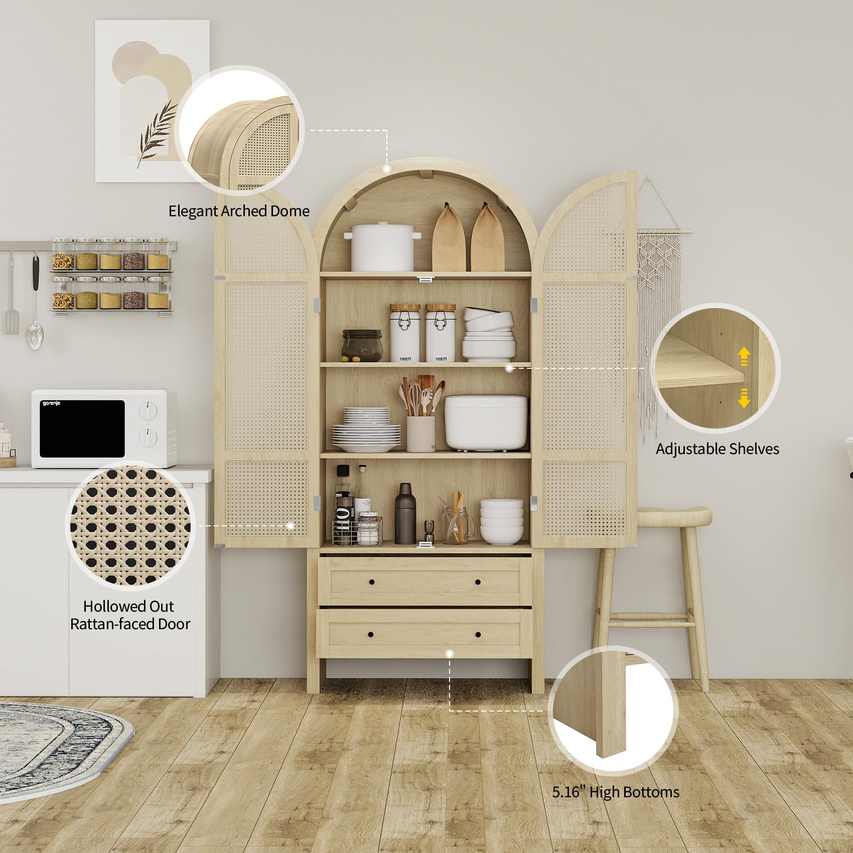 Woenei Arched Kitchen Pantry Cabinet, 71" Tall Arched Bookcase Rattan Storage Cabinet with Doors and Drawers Adjustable Shelves,Farmhouse Freestanding Cupboard for Bathroom,Living Room,Dining Room