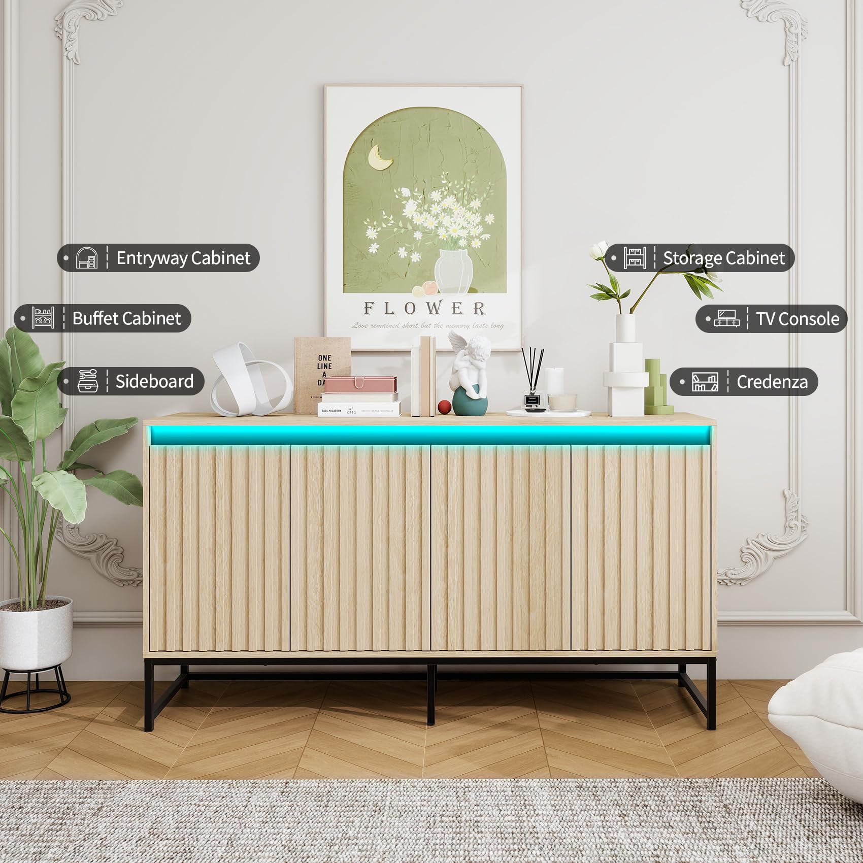 Woenei Fluted Sideboard Buffet Cabinet with Storage, 59" Wood Storage Cabinet with Doors and Adjustable Shelves LED Light, Modern Credenza for Kitchen, Dining Room, Living Room, Entryway, Oak