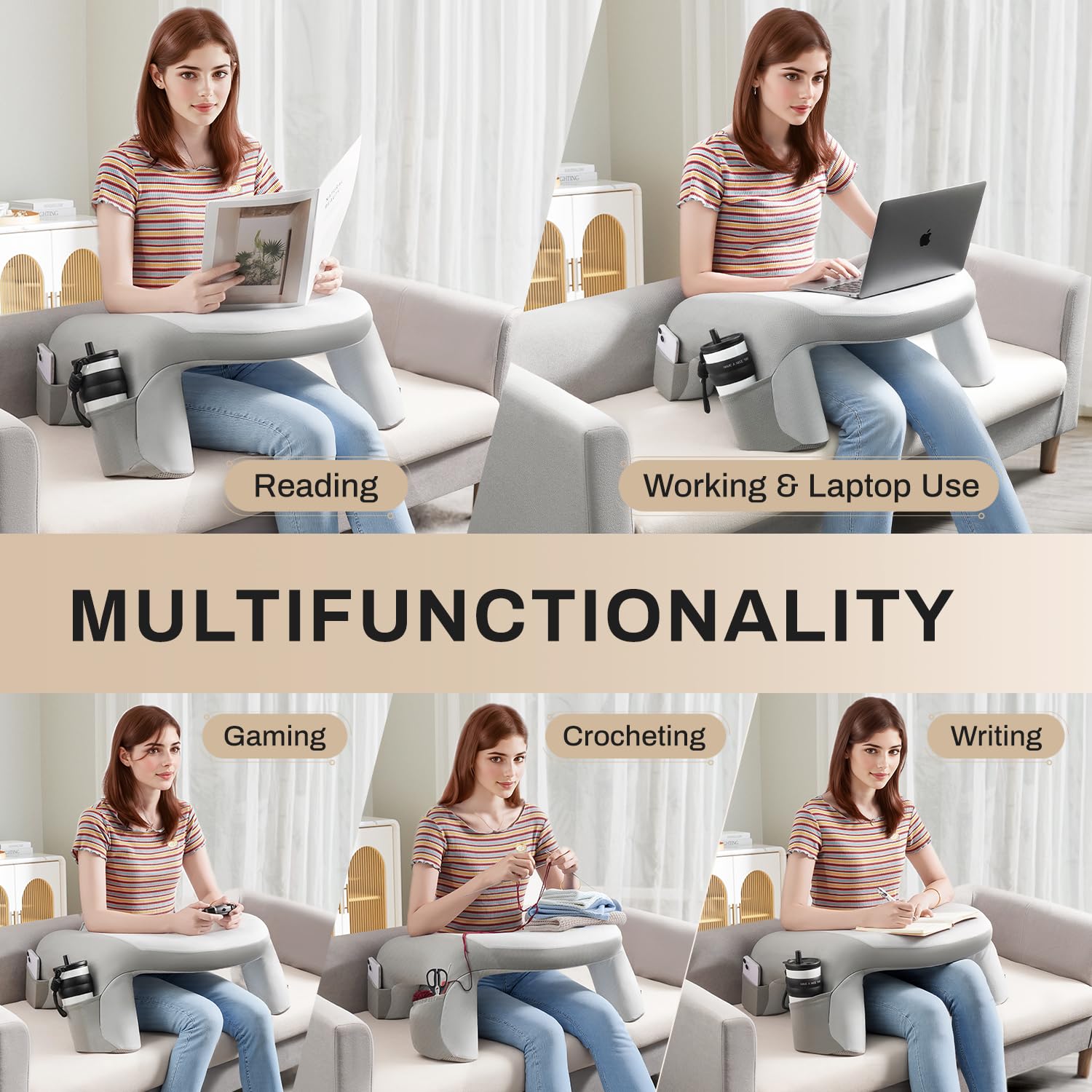 WOGAHEV Reading Pillow for Bed, Lap Desk for Laptop, Memory Foam Arm Rest Support Gaming Pillow with Cup/Phone Pocket, Laptop Lap Desk for Working, Gaming, Reading on Couch Bed Floor- Grey