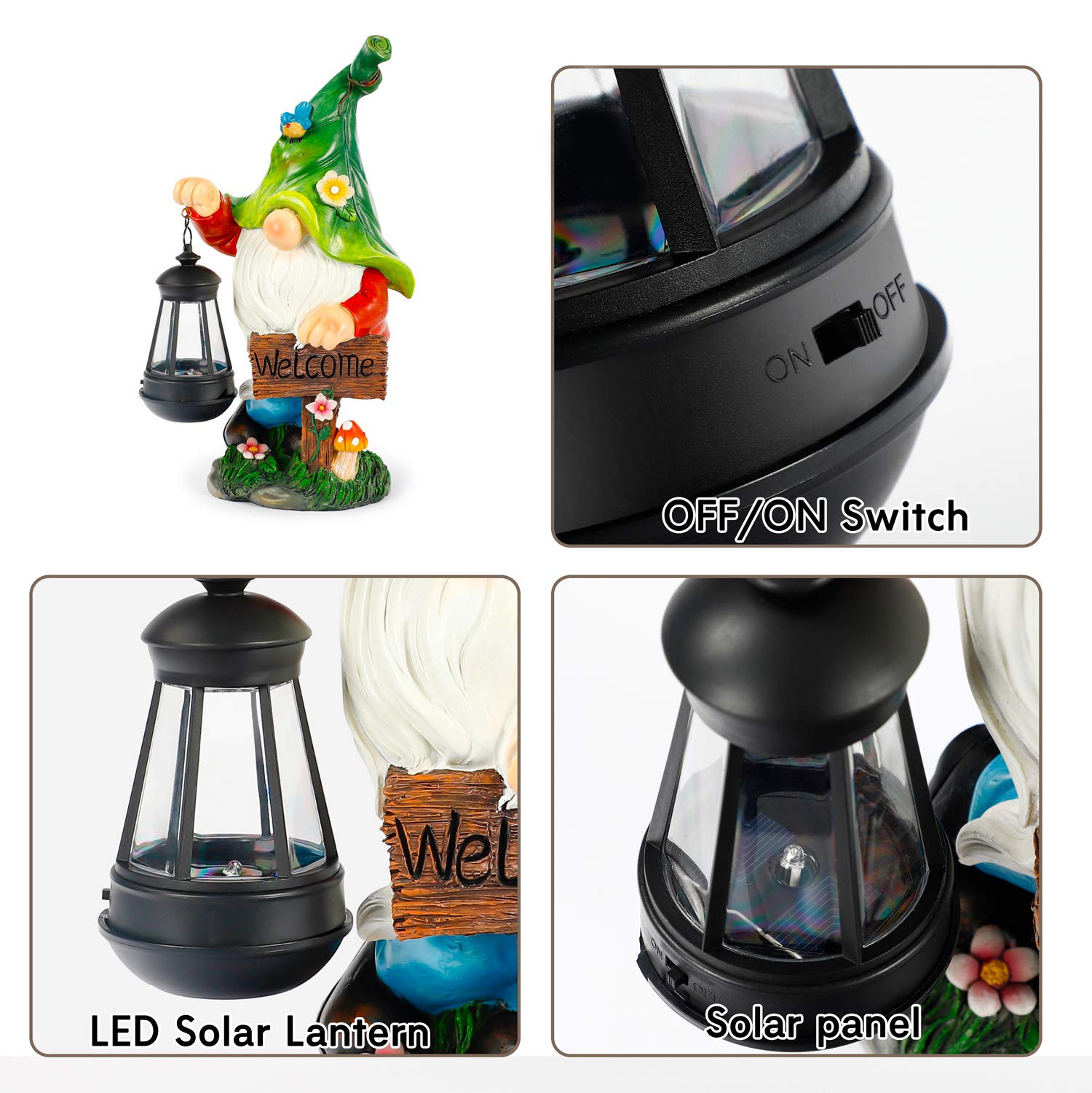 WOGOON Garden Gnome Statue, Resin Figurine with Bright Solar Lantern Lights and Welcome Sign, Outdoor Solar-Powered Illumination Yard Art Decorations for Indoor Outdoor Patio Lawn Garden Room
