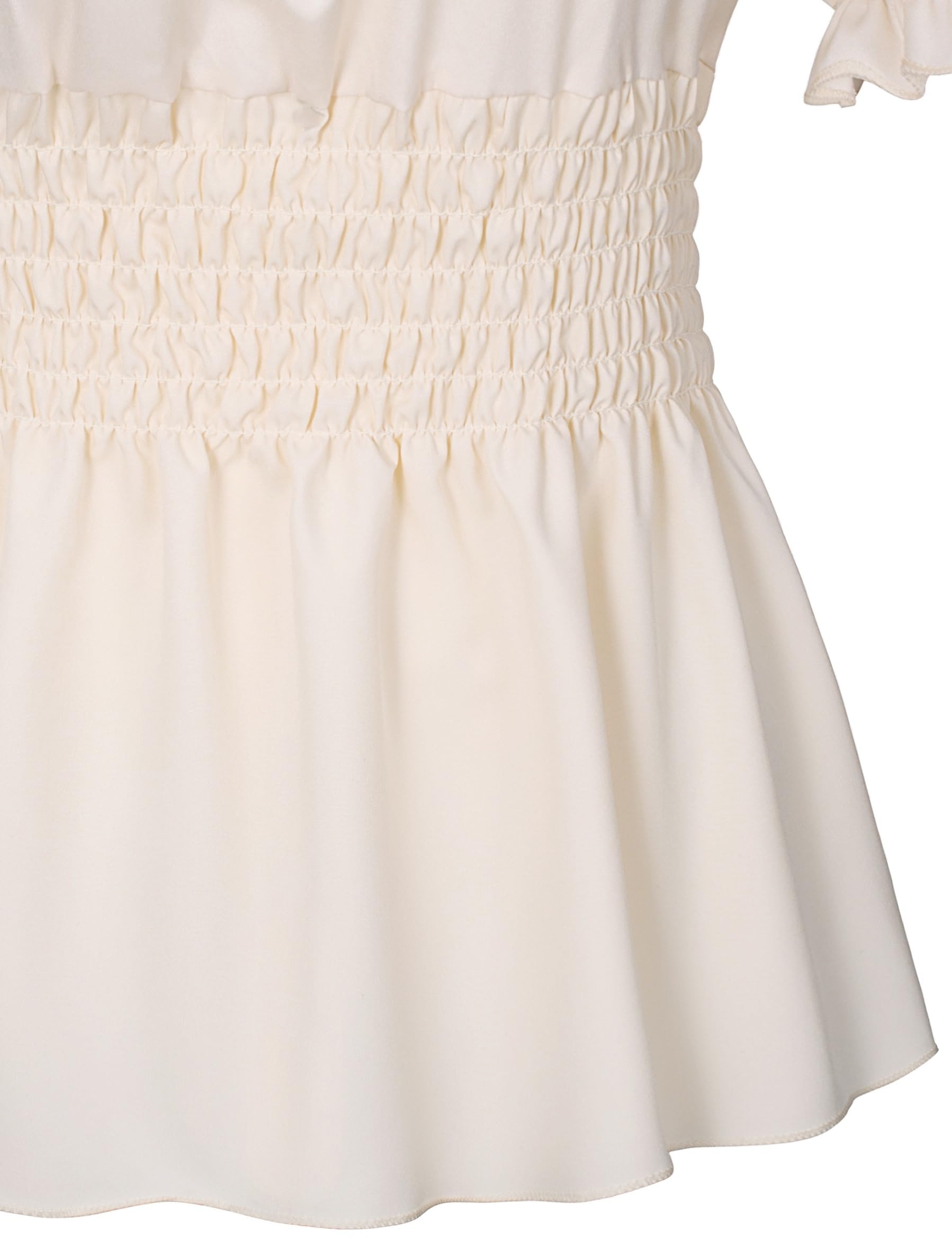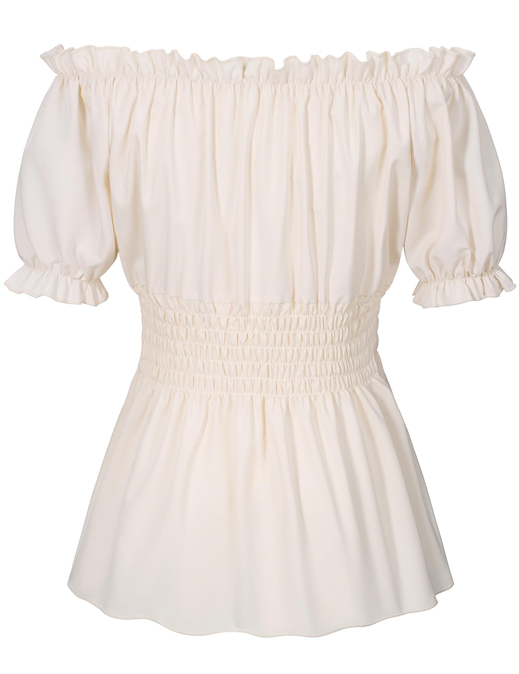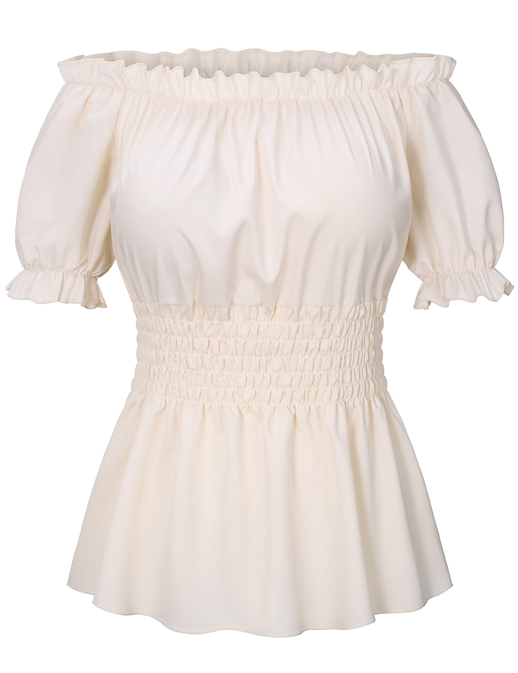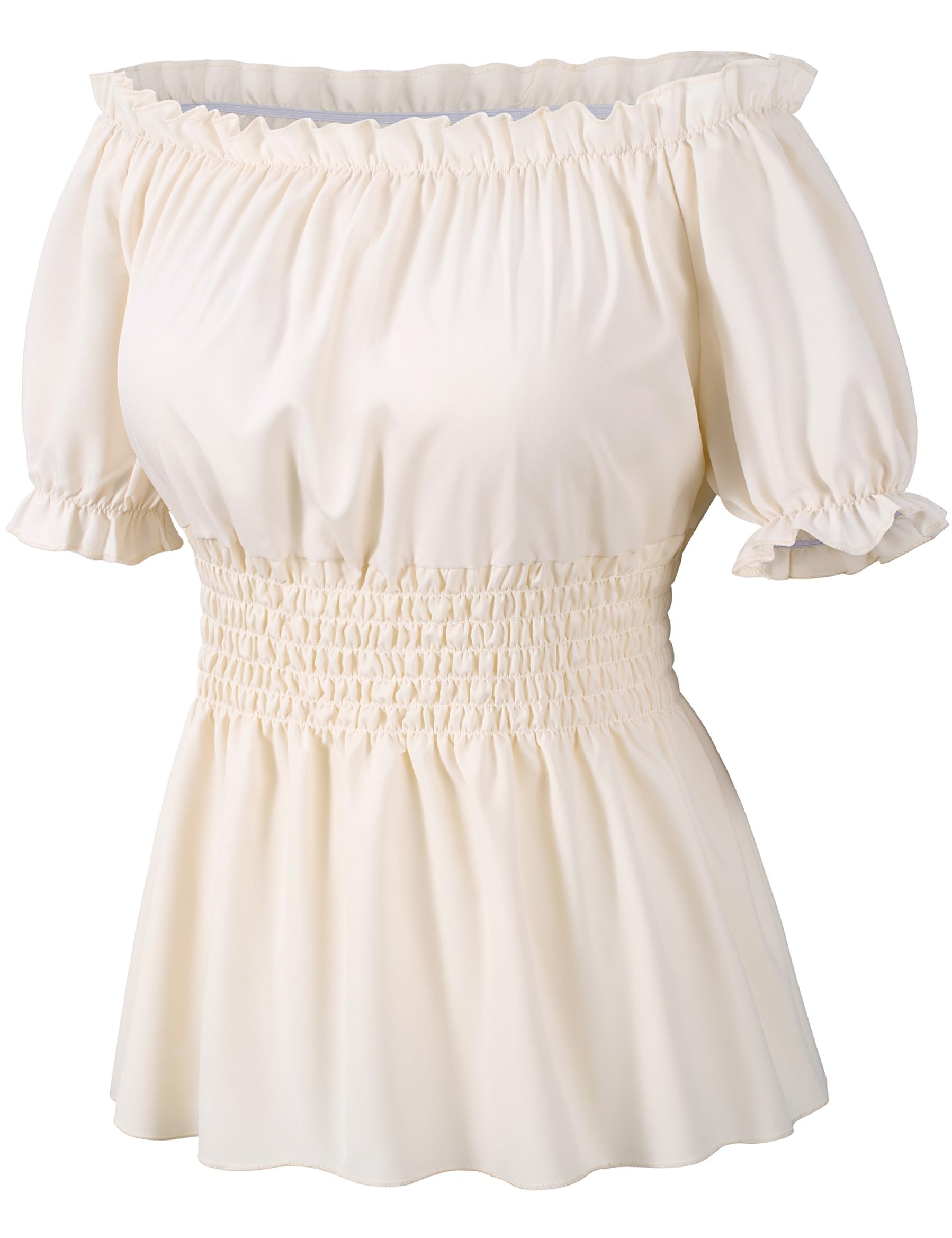 - Classic short sleeves ruffle smocked waist blouse top shirt with off shoulder design,suitable for dress up or role cosplay.