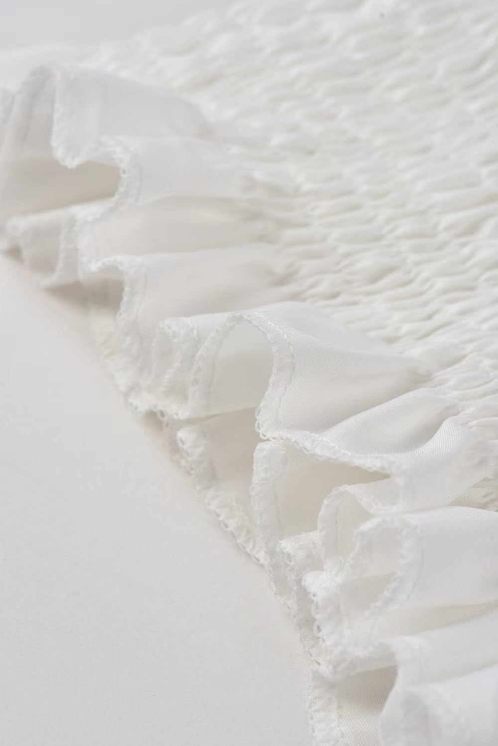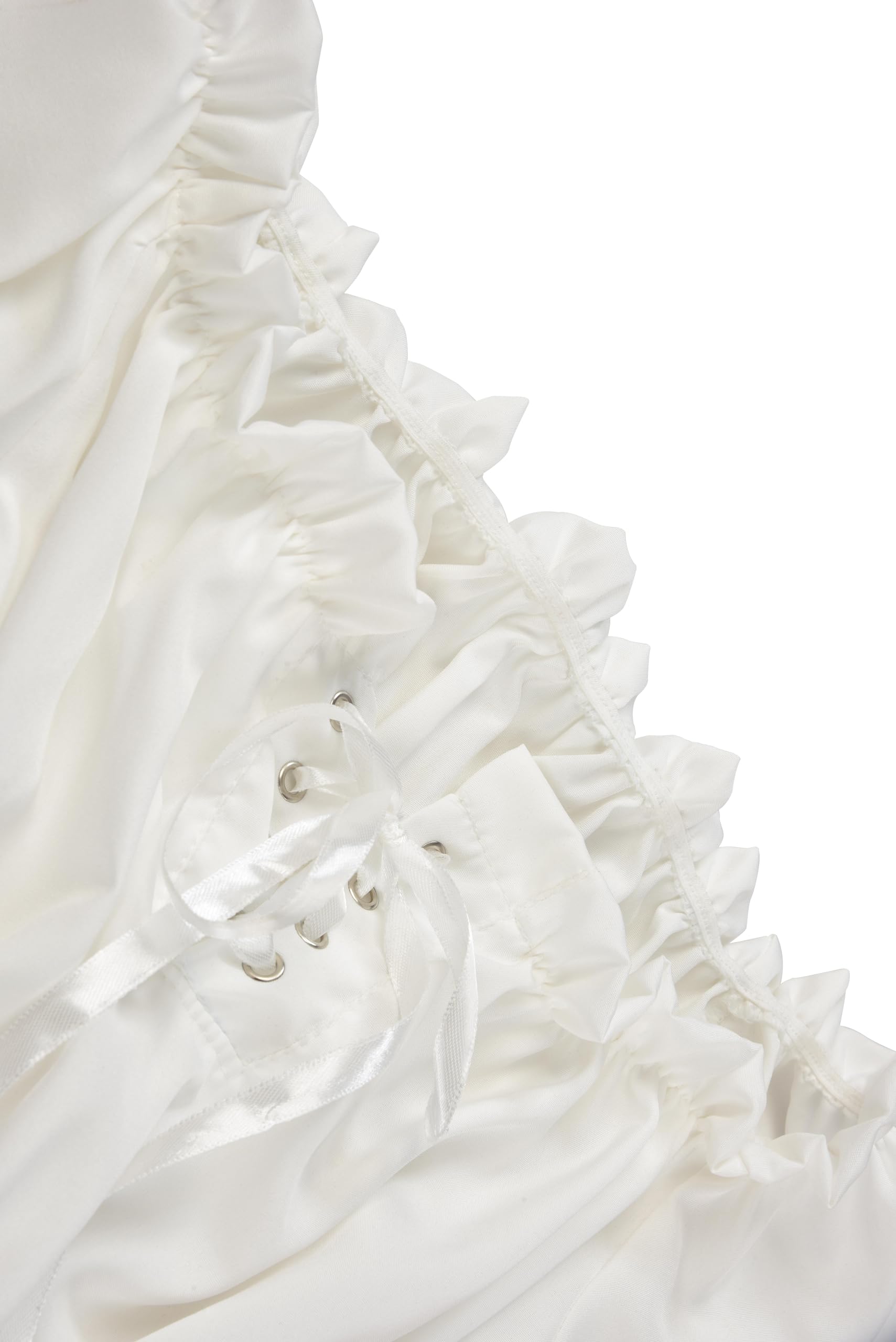 Step into the enchanting world of renaissance fashion with this exquisite white off-shoulder crop top. The smocked waist design creates a flattering, form-fitting silhouette while providing comfortable flexibility. The dramatic trumpet long sleeves add a touch of theatrical flair, perfect for medieval-themed events or costume parties. The delicate ruffle details along the neckline and hem enhance its romantic appeal, while the lace-up front adds authentic period charm. This versatile blouse features high-quality construction with gathered elastic details that ensure a secure fit. Whether you're attending a renaissance faire, theatrical production, or simply want to add a touch of historical elegance to your wardrobe, this blouse delivers both style and comfort. The crisp white color makes it easy to coordinate with other costume pieces or modern clothing items. The lightweight fabric allows for comfortable wear during extended periods, making it ideal for various occasions and seasons.