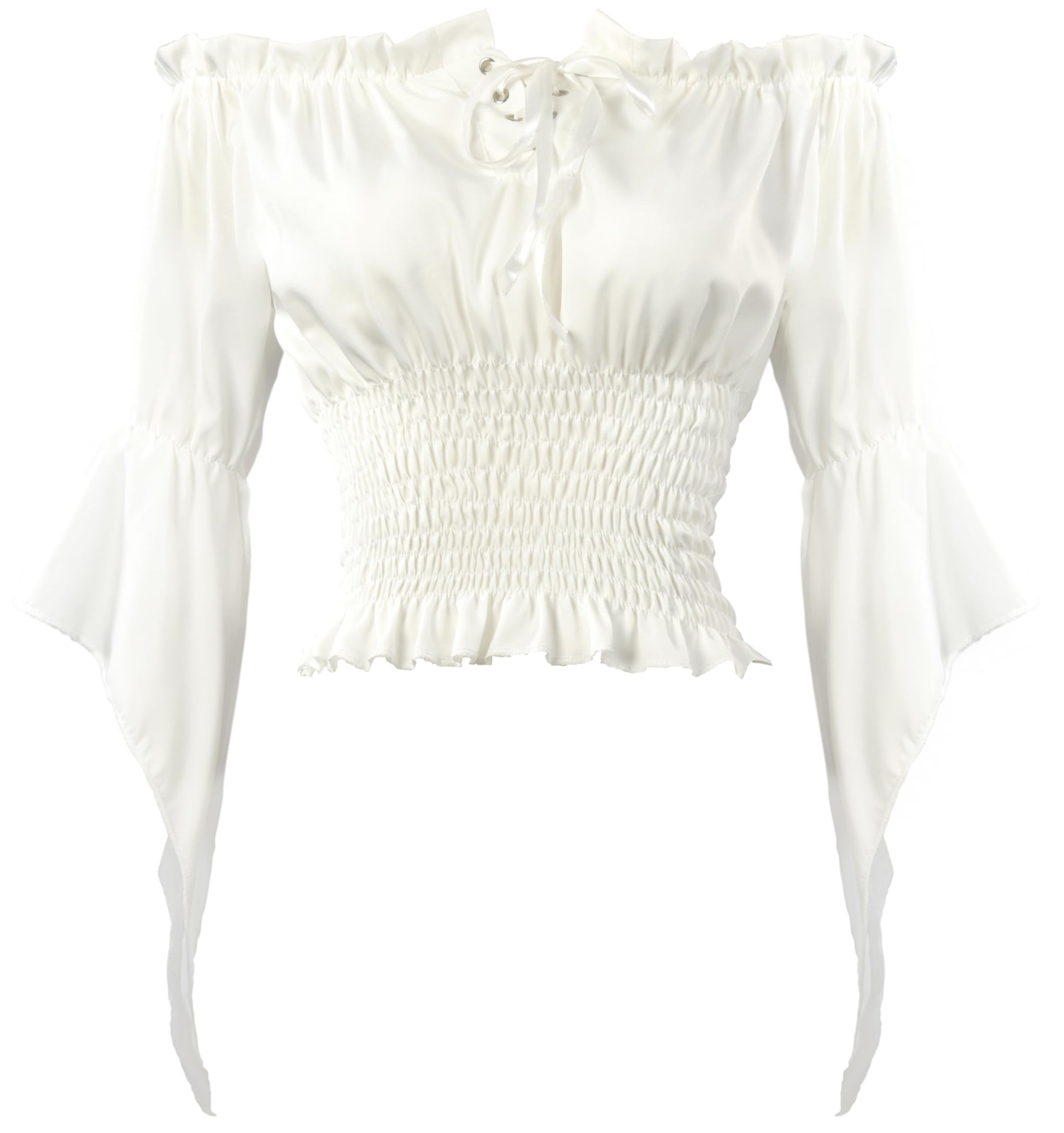 - STYLE: Cropped length blouse with romantic ruffled edges and gathered fabric details for a classic medieval look