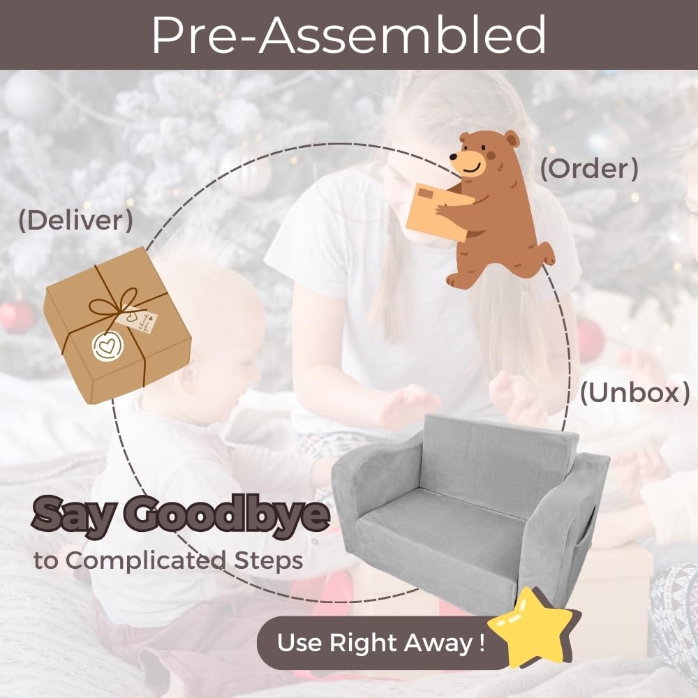 - 【Fully Assembled】 Say goodbye to assembly instructions and complicated steps. Open up this children's couch and use it right away! This no-assembly-required lounger sofa is shipped as a whole. Simply unfold it and voila! You have an inviting plush children's sofa and an eye-catching flip-out piece for playrooms, kids' rooms, nurseries, etc.