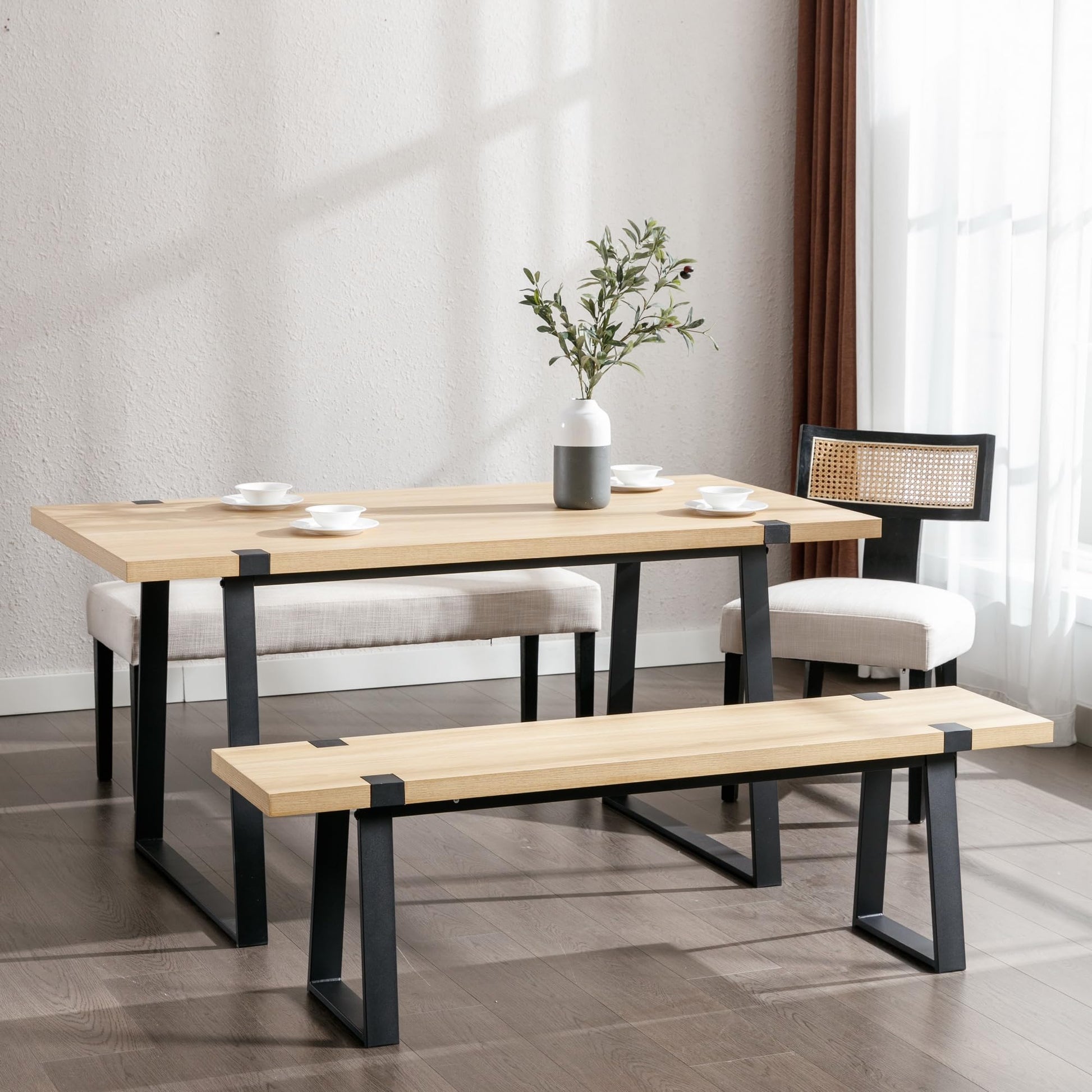 Wooden Dining Bench 60” Industrial Table Benches, Seating Chair Rustic Indoor Benches, Mid Century Kitchen Bench with Metal Legs, Light Oak