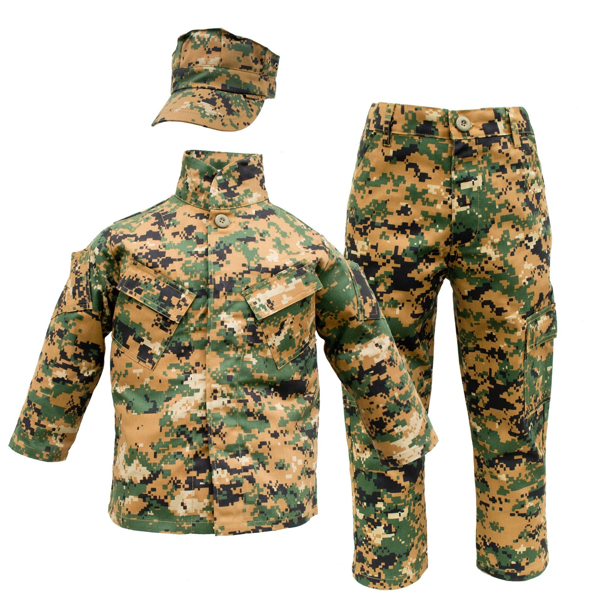Marine Woodland 3pc Trooper Set: This military look 3 pc Digitized Marine Woodland Uniform comes with an 8 point cover with Velcro closure for easy fastening, long sleeve button down top with 4 pockets, and pants with 6 pockets. It is perfect for the child honoring their Military loved ones! Made with a digital Marine Woodland Camouflage print (MARPAT). This uniform is the closest to the original issue uniform you can find on the market. Machine washable 60/40 cotton/ poly blend. OORAH!