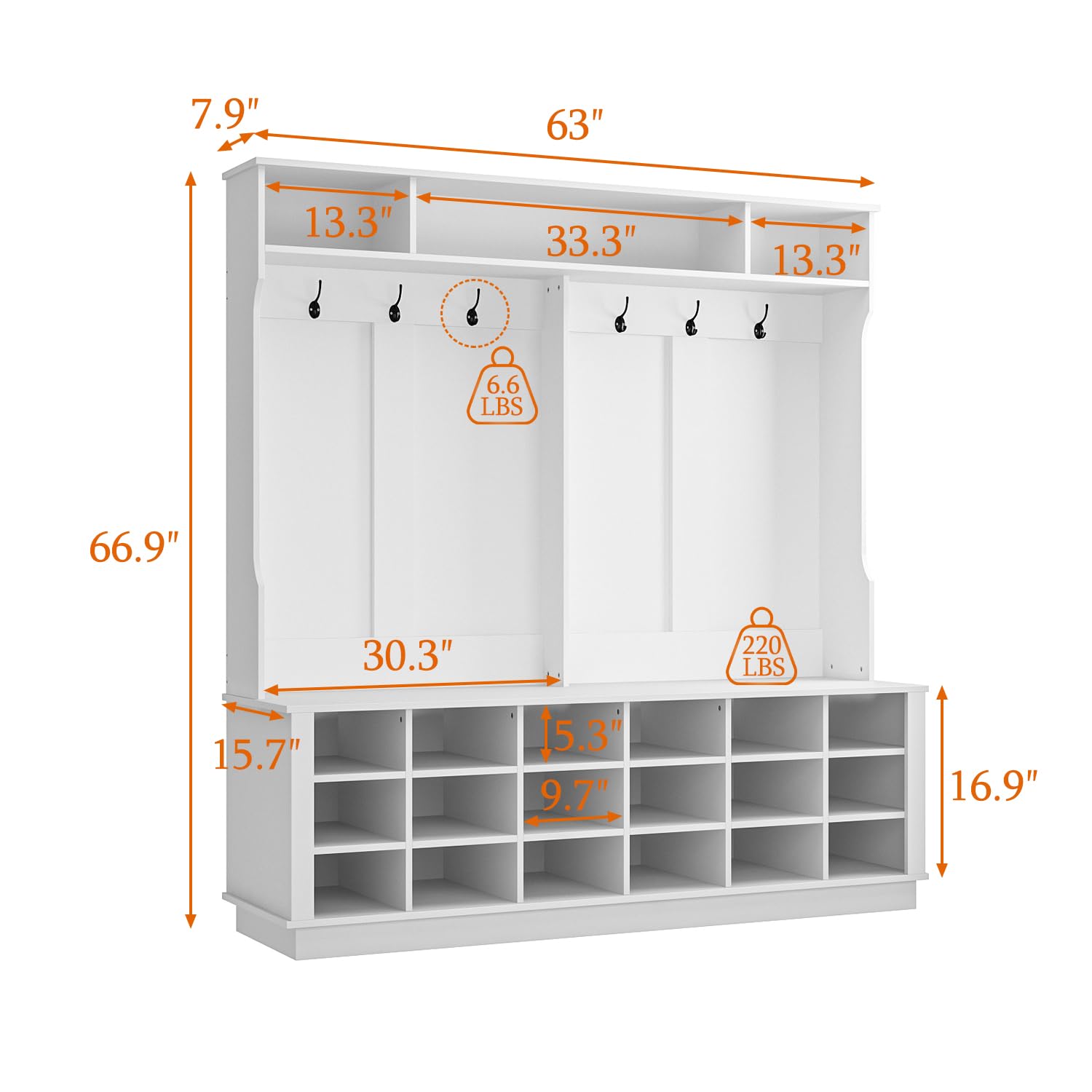 - [Multifunctional 4-in-1 Design] - This white hall tree features 6 metal double hooks, 3 open shelves on the top, 18 open shelves on the bottom, you can treat the hall tree as coat rack, shoe storage bench, shoe rack and display shelf. WOODTIME hall tree helps to optimize your space and help you create an organized and functional entryway.