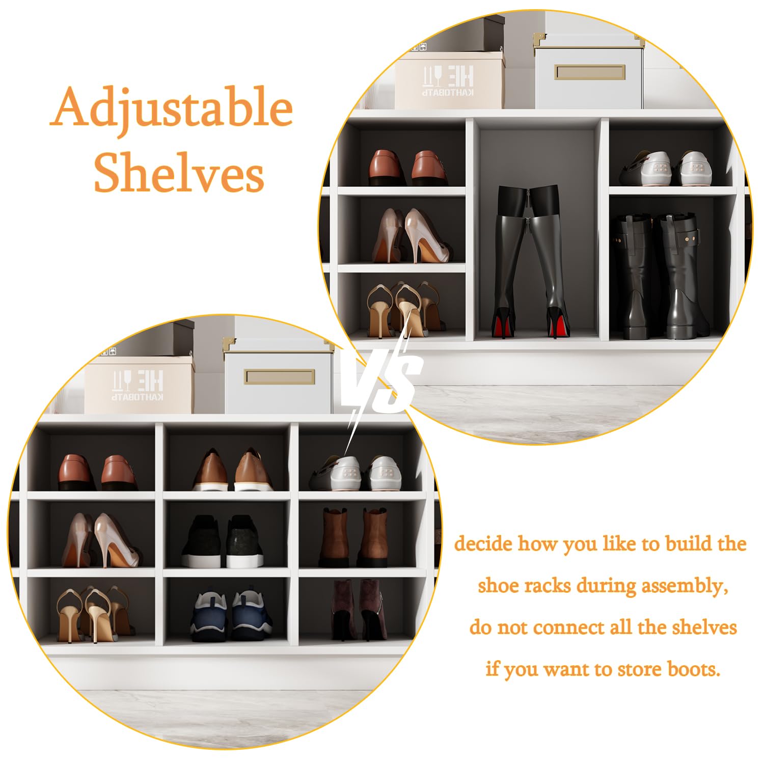- [Various Storage Solutions] - The entryway bench with storage is nice to organize your coats, bags, bags, umbrella, keys and decorative stuffs. The 18 open shoe racks on the bottom is adjustable, almost kinds of shoes can be fitted, just decide how you like to build the shoe racks during assembly, do not connect all the shelves if you want to store boots.