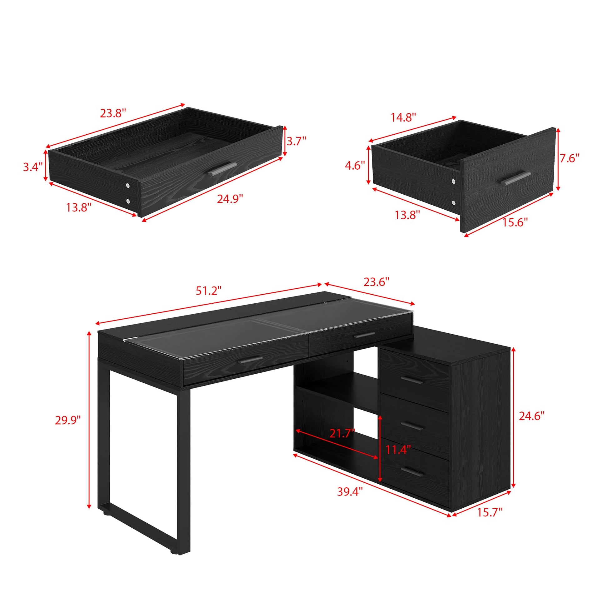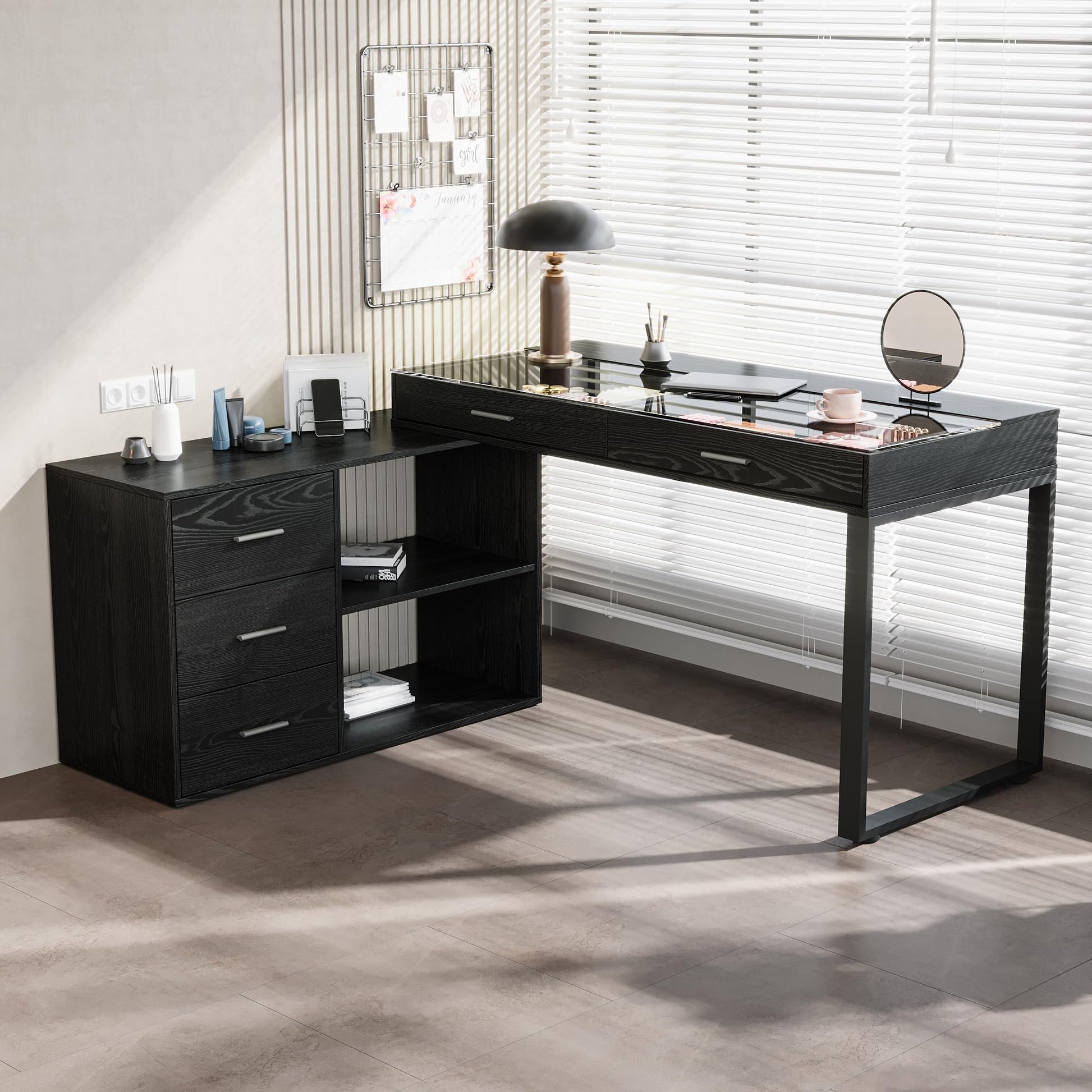 WOODTIME L-Shaped Makeup Vanity Desk with Glass Desktop & Cabinet, Corner Dressing Table with 5 Drawers & Shelves, Black Wood Grain