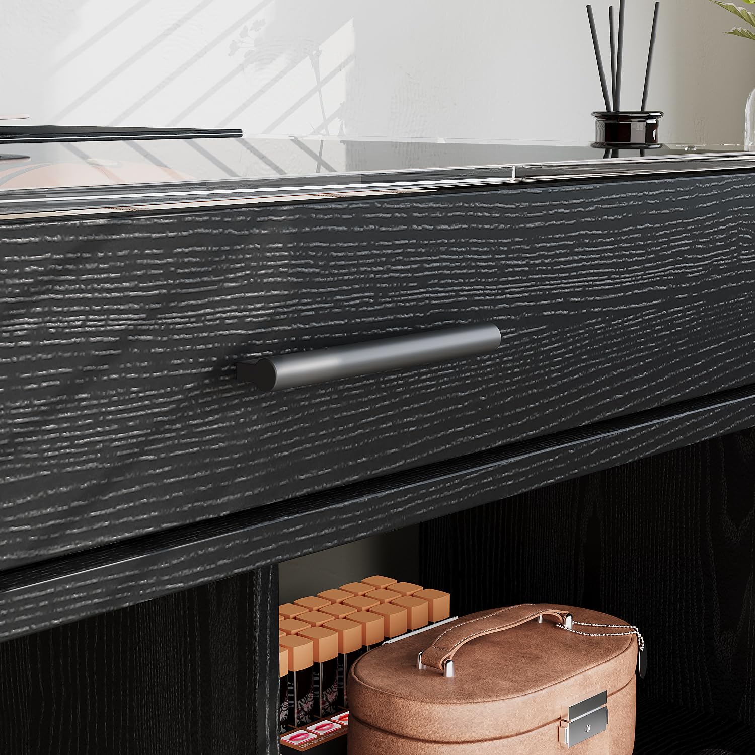 - [Glass & Wood Grain] - The black wood grain finish with black metal legs and handles is elegant. The glass desktop is not only convenient for you to access your items, but also allows you to display your various cosmetics, creating a professional and personalized makeup area