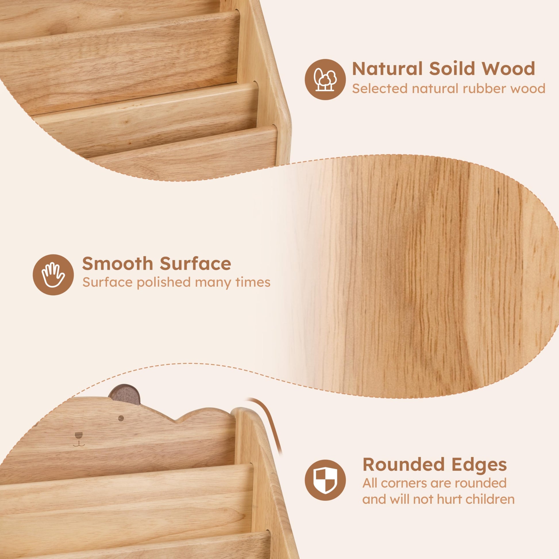 - Natural Safe Material: Crafted from durable rubber wood with rounded edges and water-based paint, this baby bookshelf meets strict safety standards. The smooth surface ensures worry-free interaction for toddlers during reading and playtime.