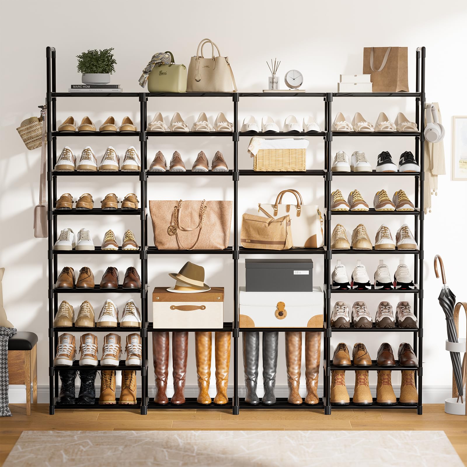 - Store Up to 64-68 Pairs of Shoes: The tall shoe rack is 66.60x9.84x60.30 Inches.The heightened design has more space and can hold 64-68 pairs of shoes to keep your limit space well organized. Different height levels fit boots, high heels, shoe box or other larger access4 Row 9 Tiers Extra Large Shoe Rack 72-80 Pairs Big Tall Metal Shoe Shelf, Heavy Duty Shoe Rack Organizer for Closet Entryway, Boot Rack Storage Stackable Shoe Rack for Garage Blackories.