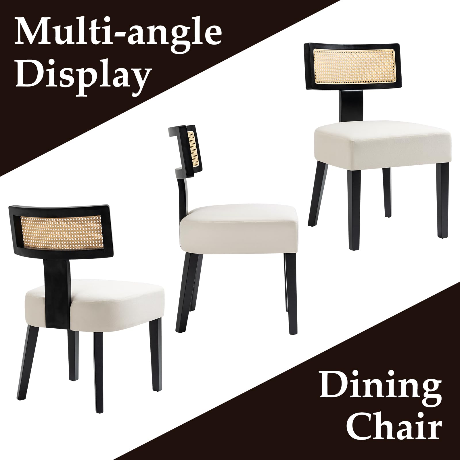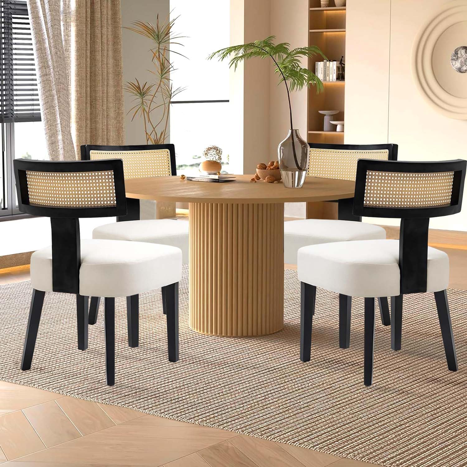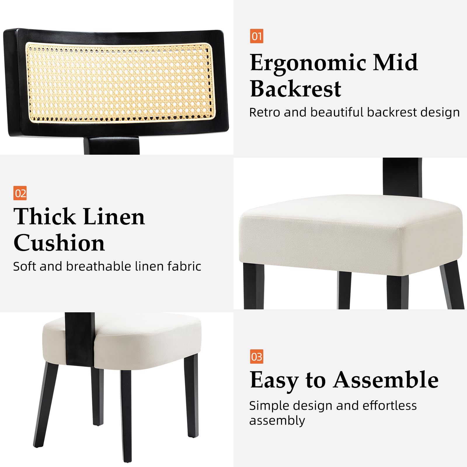 WQSLHX Rattan Dining Room Chairs Set of 4, Mid-Century Modern Kitchen Chair with Cane Back & Wood Frame in Black Finish, Beige Linen Upholstered
