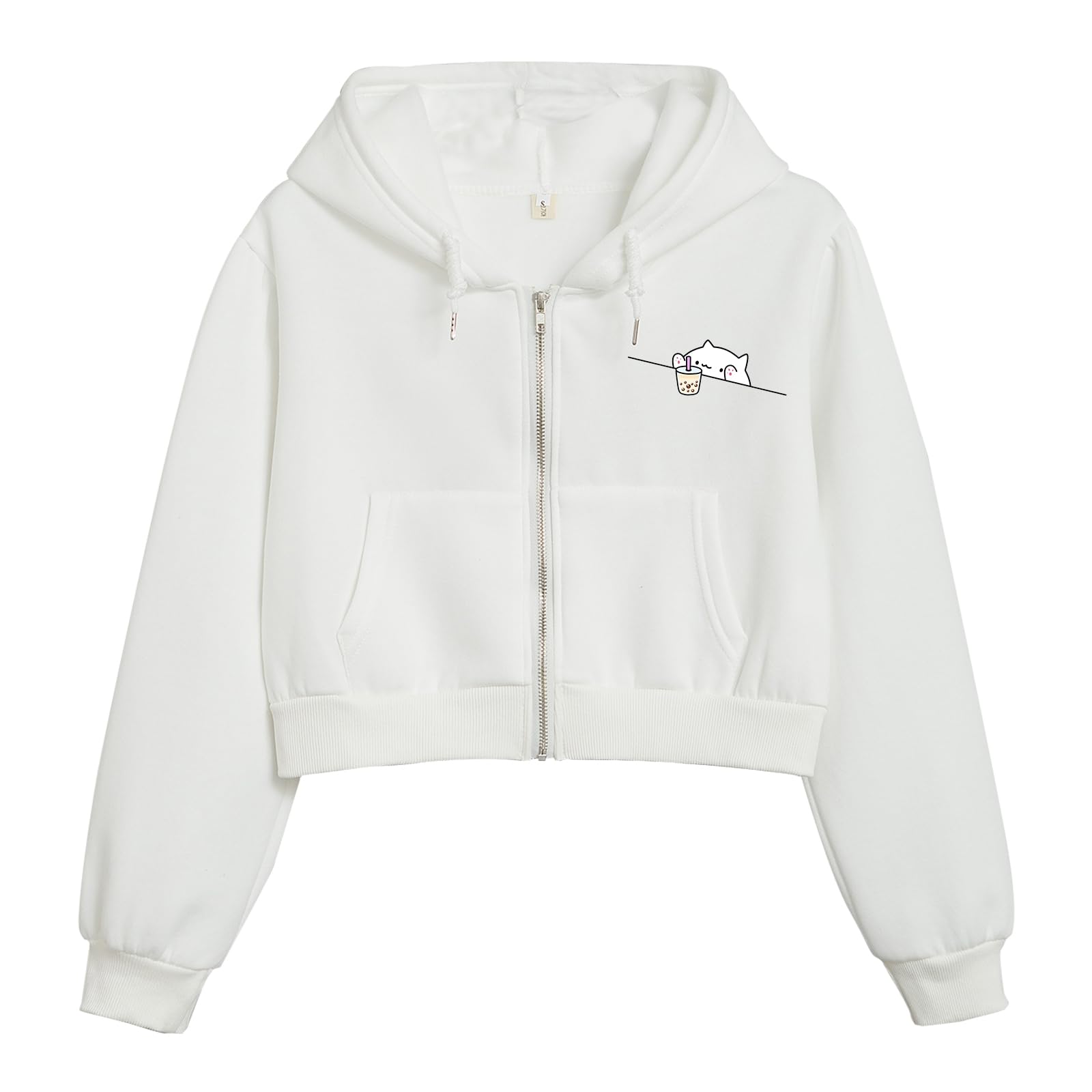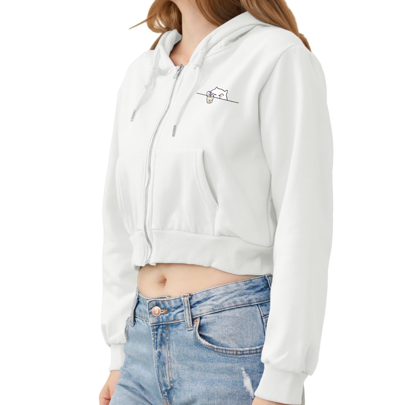 Wrenpies Cute Cropped Zip Up Hoodie for Teen Girls Cartoon Cat Graphic Kawaii Aesthetic Pockets Hooded Sweatshirts Jackets (White,S,Small)