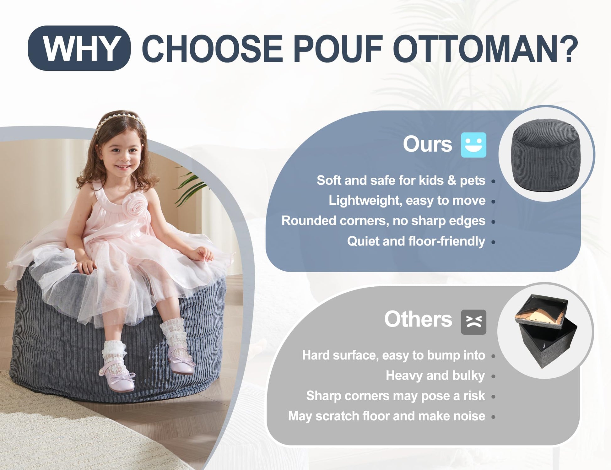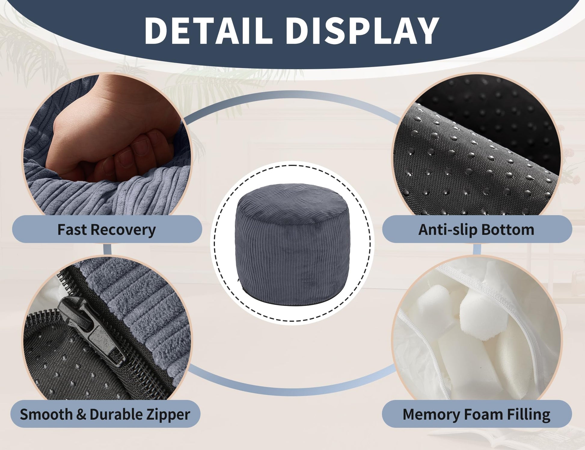 - Comfortable, Compact & Stylish foot ottoman: Made with soft, breathable corduroy and round ottoman cover filled with high-resilience foam, this footstool ottoman (20"x20"x15") offers both comfort and support. The footrest ottoman's compact size makes it perfect for small spaces, while bean bag ottoman's versatile design fits beautifully in living rooms, bedrooms, dorms, and kids' play areas.