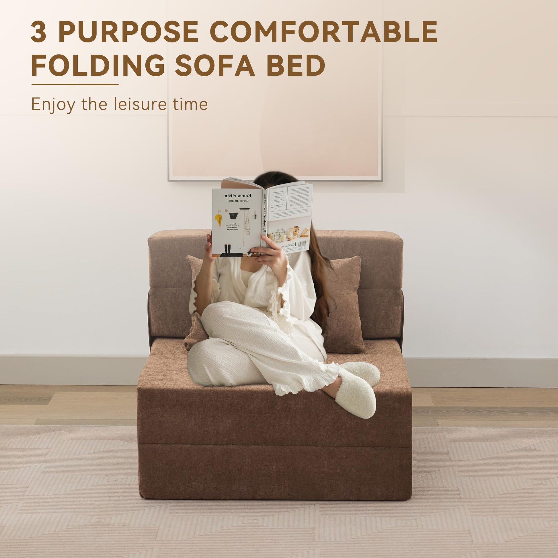 WUTUTUEE Folding Sofa Bed Convertible Floor Couch Foldable Chair Bed with Pillow, Linen Sleeper Chair Futon, Foldable Memory Foam Mattress for Bedroom/Living Room/Dorm/Office (Brown, Single)