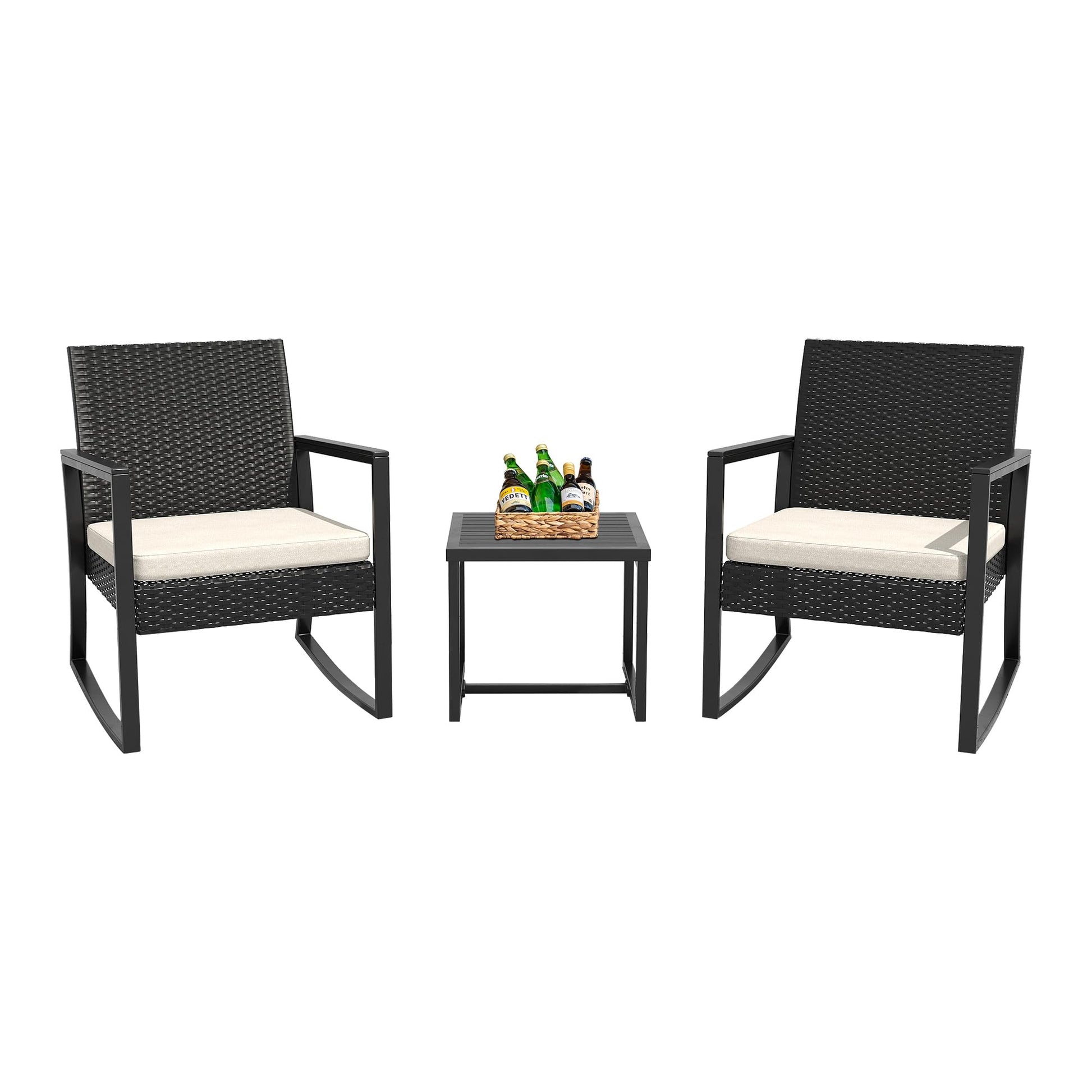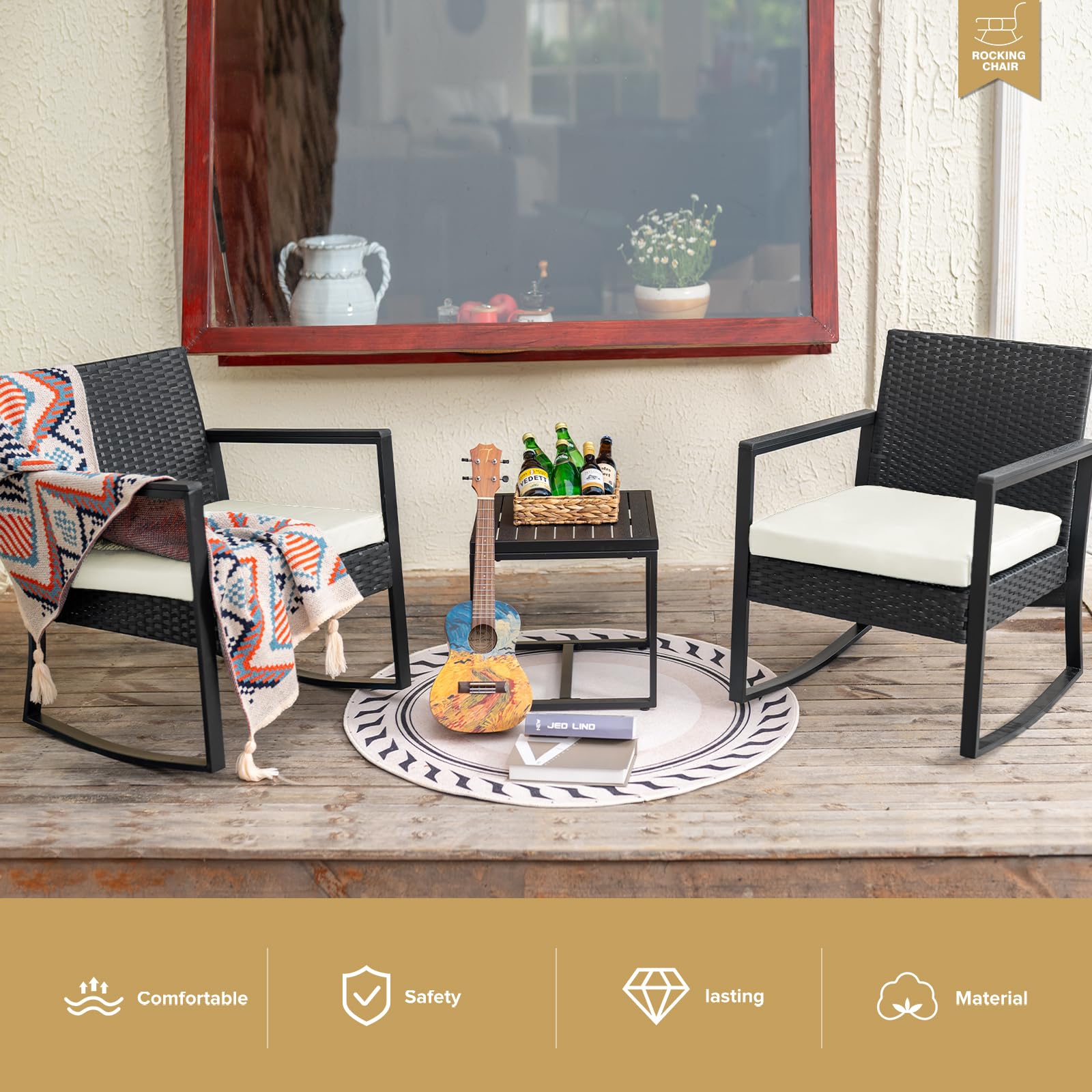 WWR 3 Pieces Outdoor Patio Furniture Set Rocking Wicker Rattan Chair Set Patio Bistro Conversation Set 3 Pcs with Coffee Table for Yard & Bistro (Sand)
