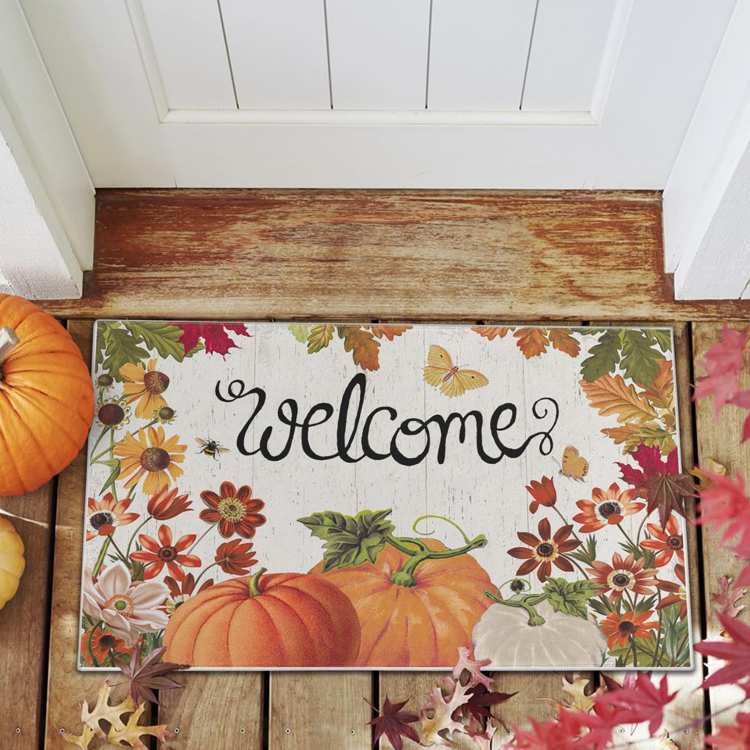 wyoansfhd Fall Pumpkin Doormat, Autumn Home Decor Entry Door mat, Pumpkin Doormat, Low Profile Entry, Non-Slip Farmhouse Mat, Outdoor Welcome Mat 17x30 Inch