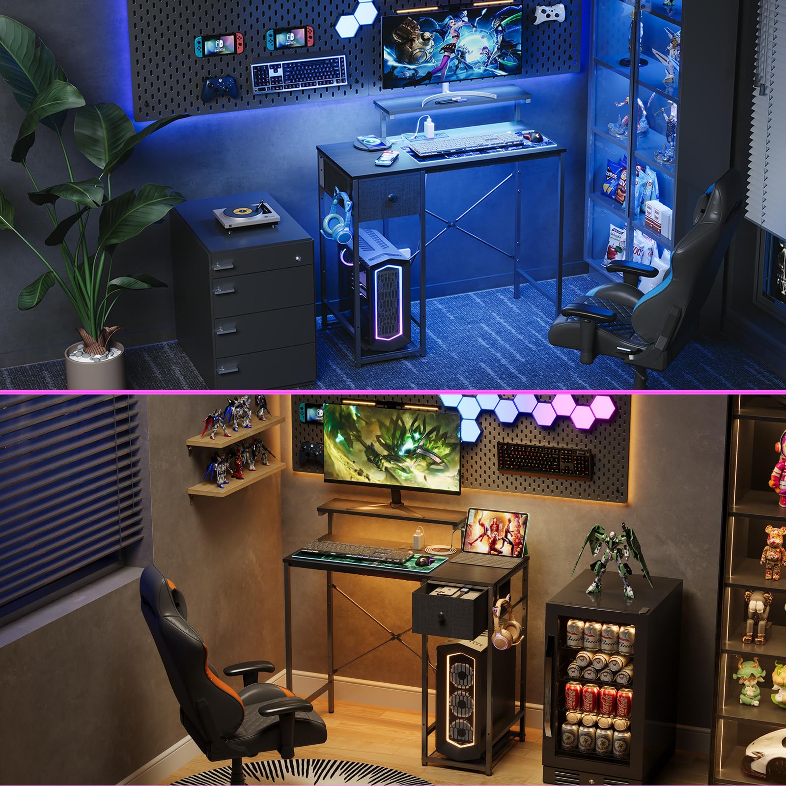 - [ All-in-One Compact Gaming Desk ]: 33.5 inch space-saving gaming desk integrates 6 essential features: ✅ Remote RGB LED lights (256 colors) ✅ 3-in-1 power hub (2 AC + USB/Type-C) ✅ Ergonomic monitor stand (used as monitor stand or storage shelf) ✅ Fabric storage drawer (hidden compartment) ✅ Reversible CPU stand (fits PC case, books) ✅ Headphone hooks. Perfect as a small desk for home office or gaming desk for bedroom corners.