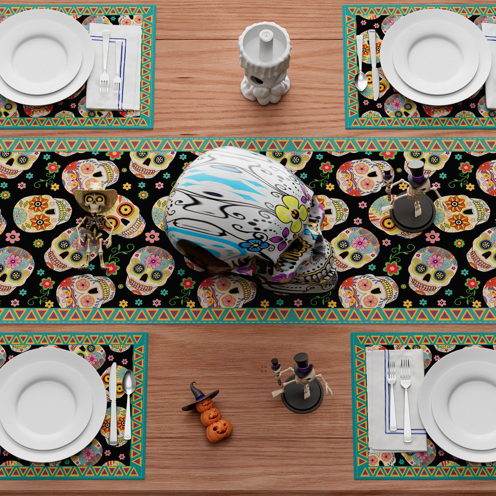XCHI Sugar Skull Flowers Dia De Los Muertos Table Runner Day of The Dead Mexican Table Decoration for Home Kitchen Dining Holiday Fiesta Themed Party Decor 13x72 Inch