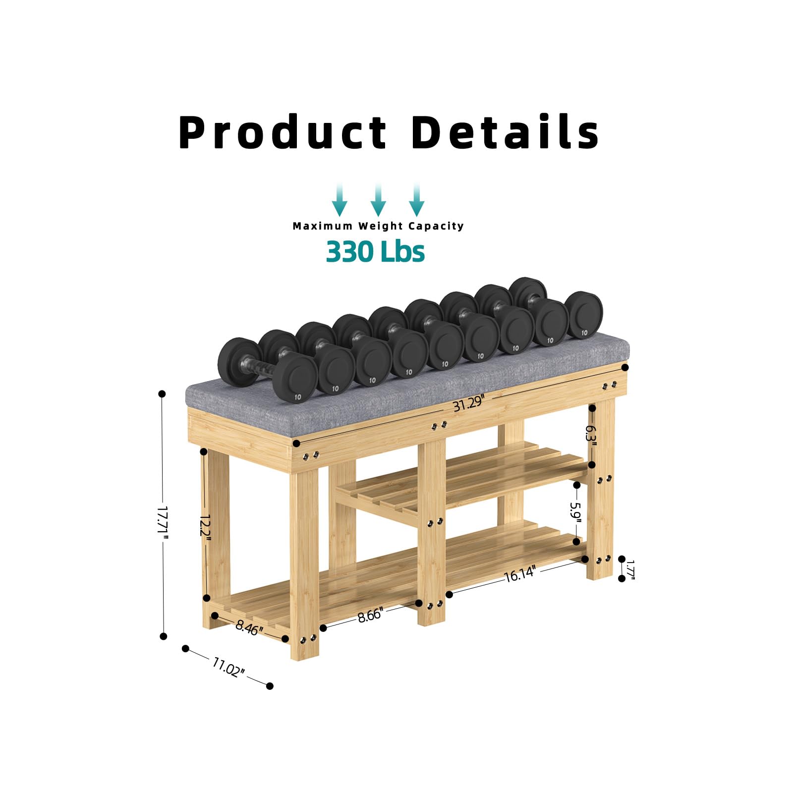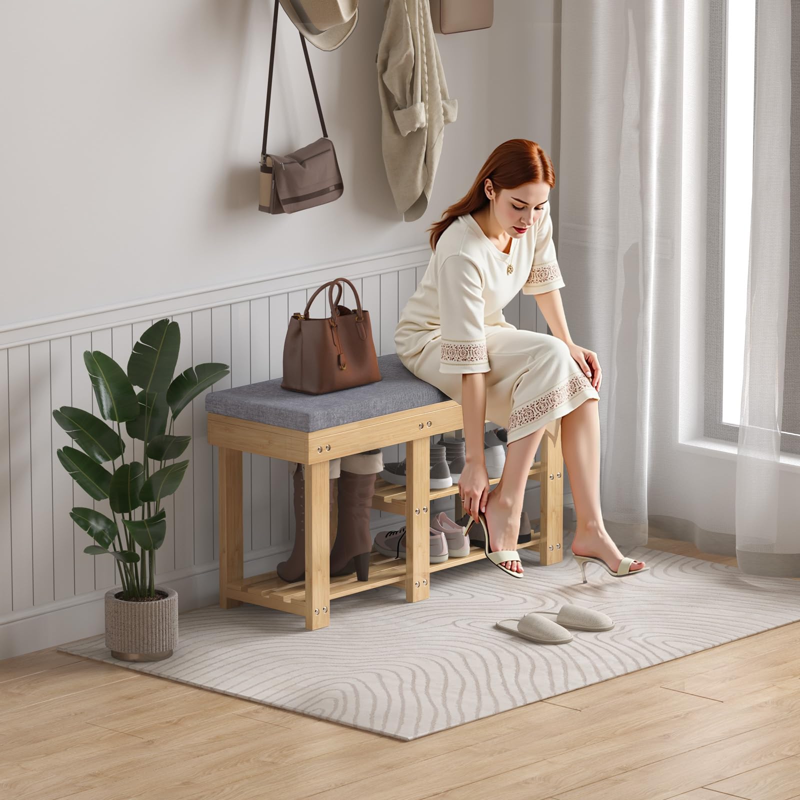 Xdwwhome Bamboo Shoe Bench, 2 Tier Storage Benches with Seat, Shoe Shelf with Cushion, Modern Entryway Bench for Living Room Bedroom Hallway Bathroom Garden, Capacity 330 lbs, Natural