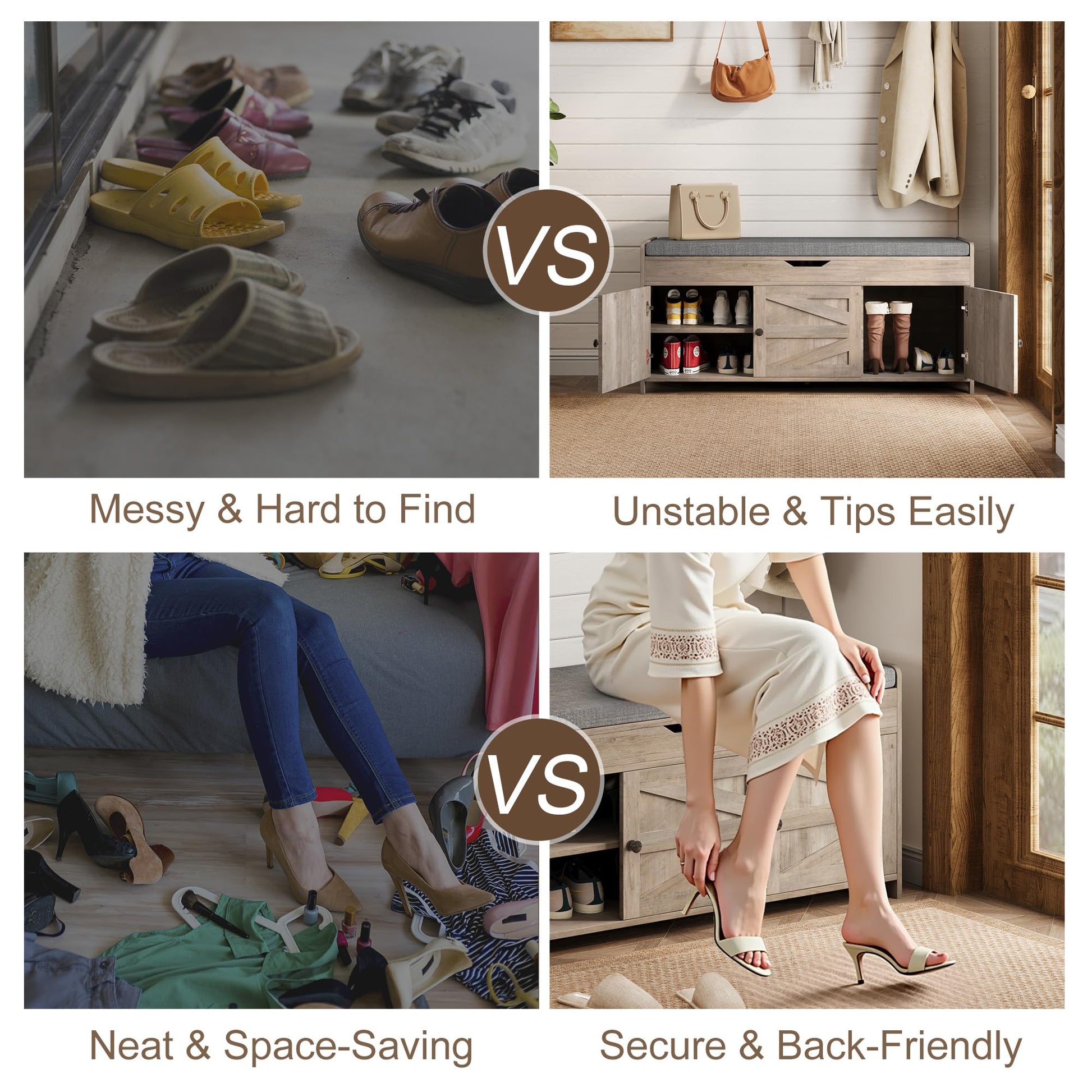 - 【Tidy & Organized Entryway】 Say goodbye to clutter! Our multifunctional entryway bench with a lift-up storage compartment is the ultimate solution for keeping your space tidy and organized. Lift the top to reveal a spacious storage area, perfect for storing all your essentials. The bench is designed with dedicated sections for tall boots and short shoes, ensuring your footwear stays neat, easily accessible, and ready to go. It also creates a warm and inviting first impression for your home
