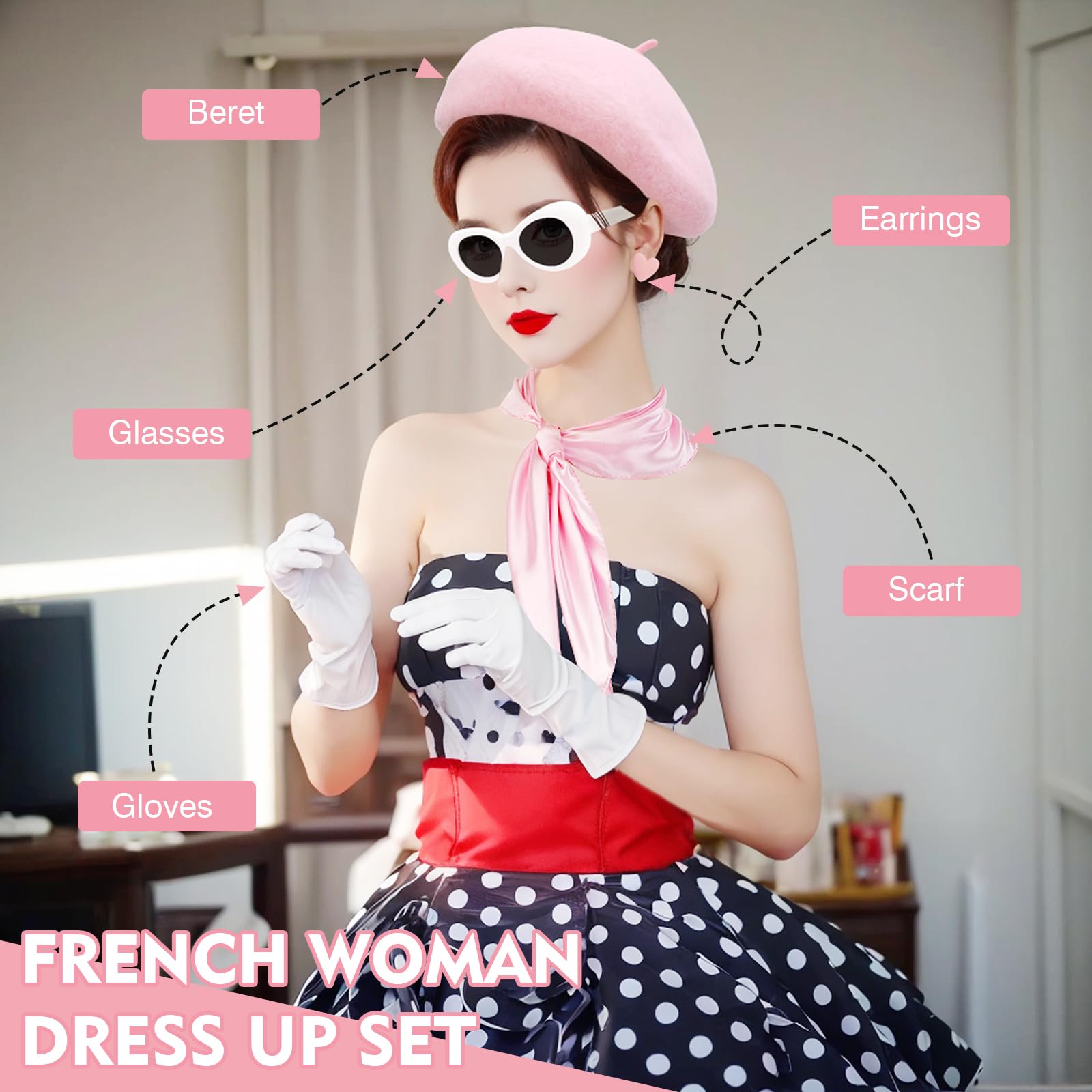 - 【Package Including】This French costume set includes everything you need to complete your French costume: 1 French beret, 1 pair of sunglasses, 1 scarf, 1 pair of gloves, 2 earrings. These French accessories make for the perfect combination to complete your party outfit needs with a 50s touch.