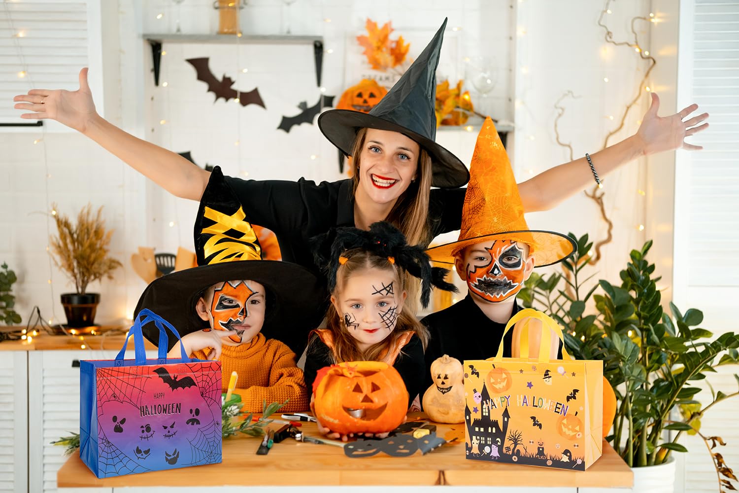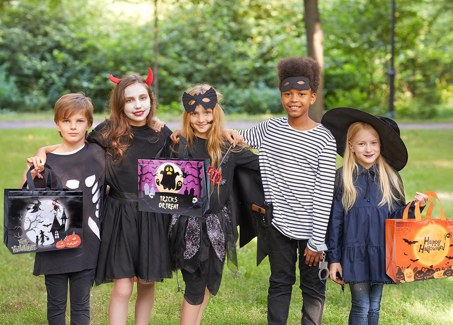 - Perfect Size and Convenient to Carry: Each Halloween tote bag with handles measures 32.5×25×17 cm/12.8"×10"×6.7". They are large in size and can hold items such as candies, biscuits, chocolates, cards, toys, even shoe boxes, etc.