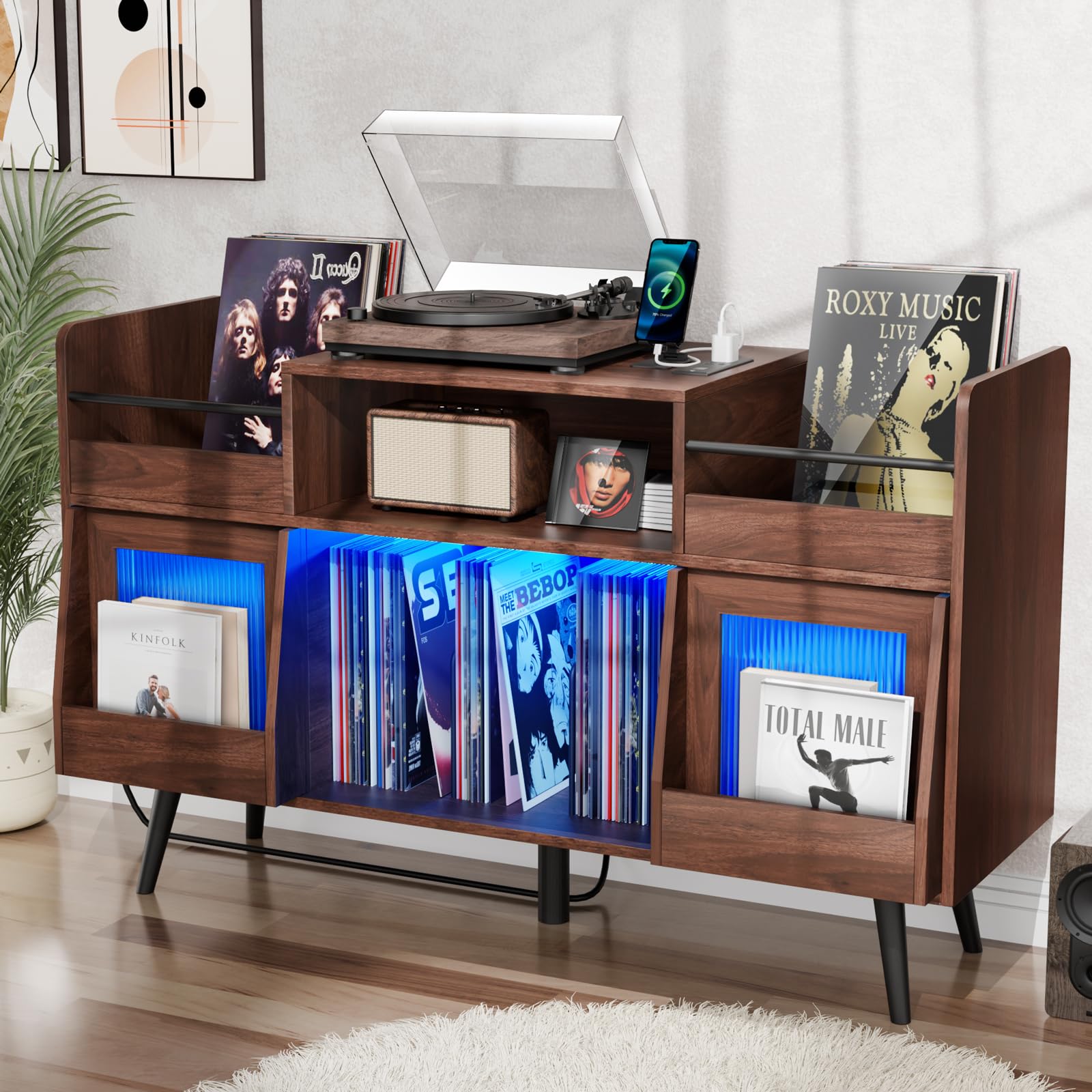 XL Record Player Stand,Turntable Stand Shelf with with Power Outlet and LED Light,Vinyl Record Storage Cabinet Up to 500 Albums, Wood Record Player Holder Table for Living Room