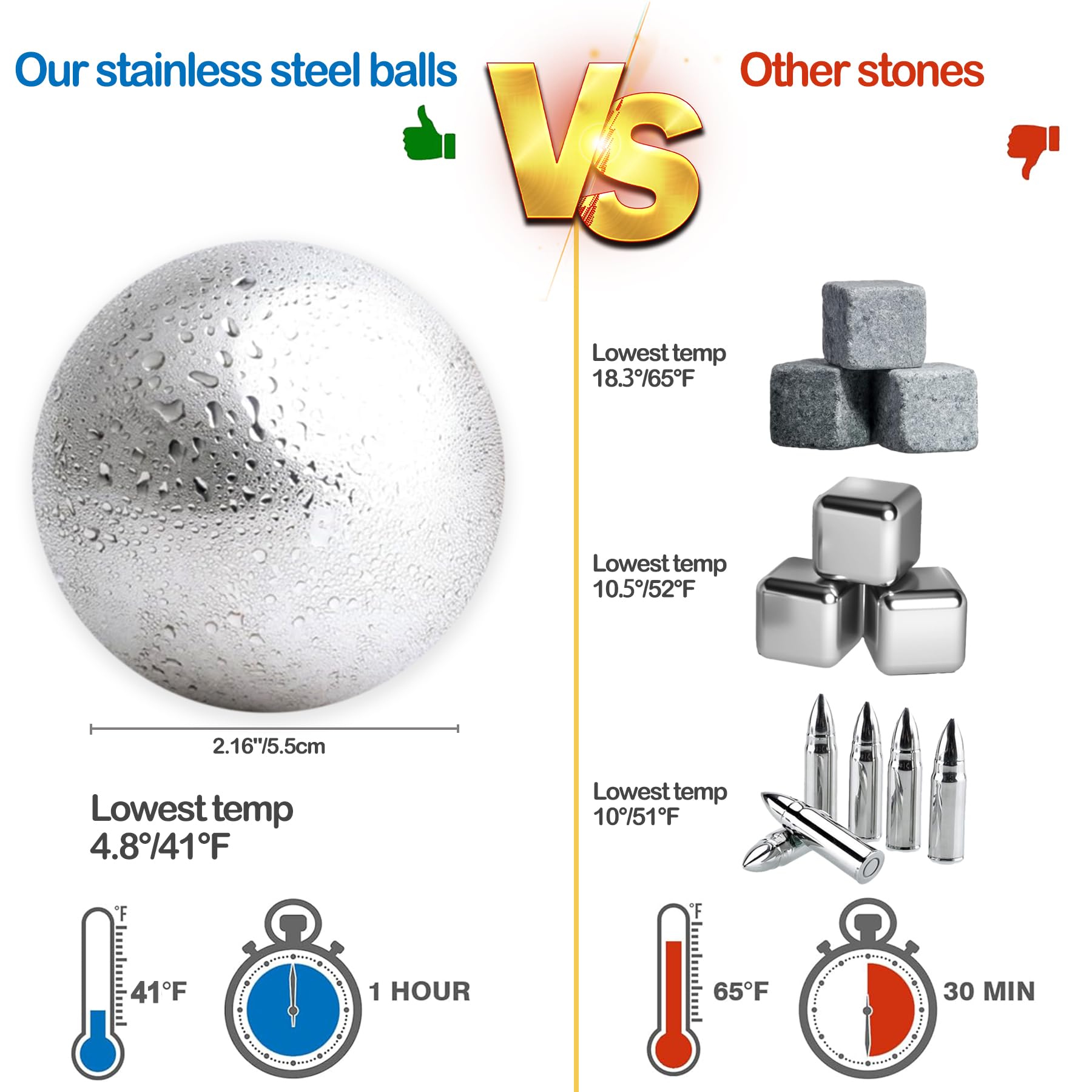 - 【An Extra Large Whiskey Ball】No watered drinks - no dirty ice whiskey stones anymore. Each whiskey ball is made of food grade 304 Stainless Steel,The large 2.1" (55mm) Stainless Steel whiskey ball will chill your whiskey in no time, upgrading your whiskey enjoyment. bourbon gifts for men. whiskey gifts for men.
