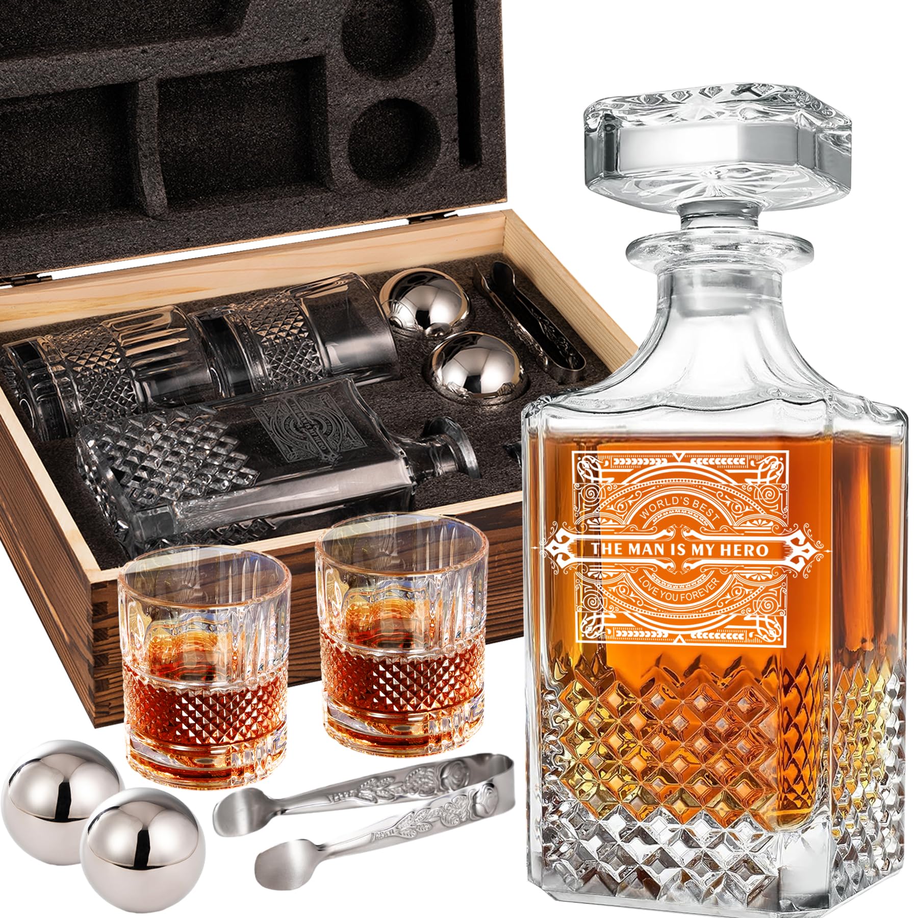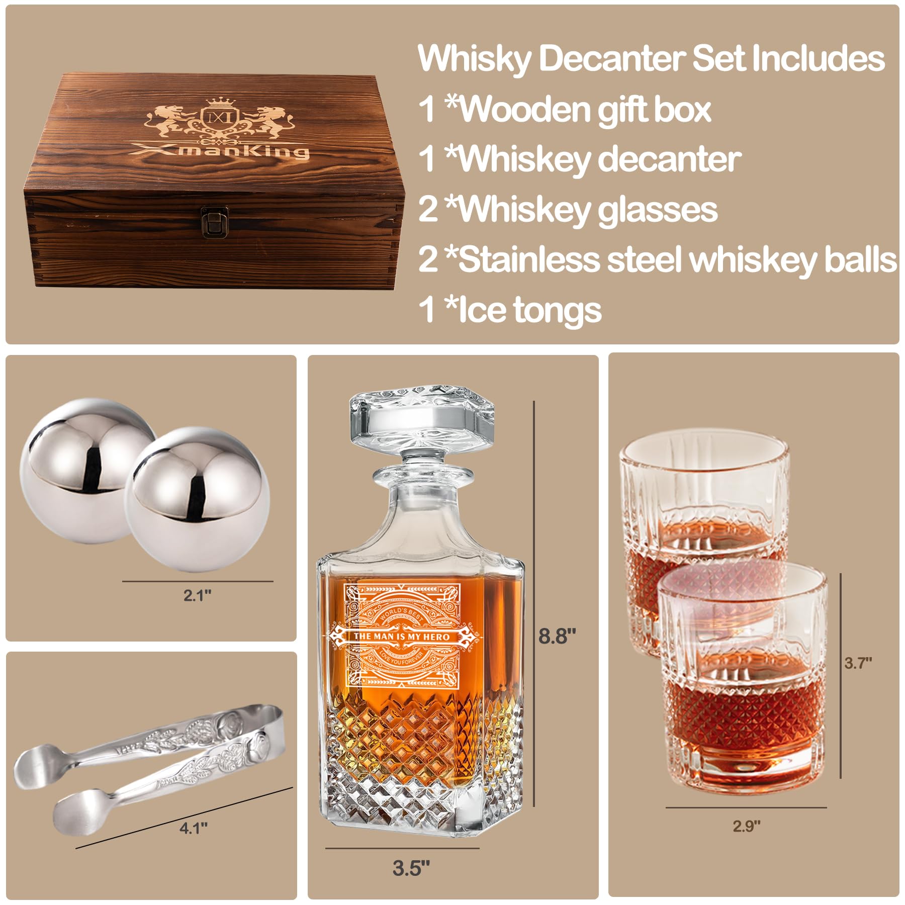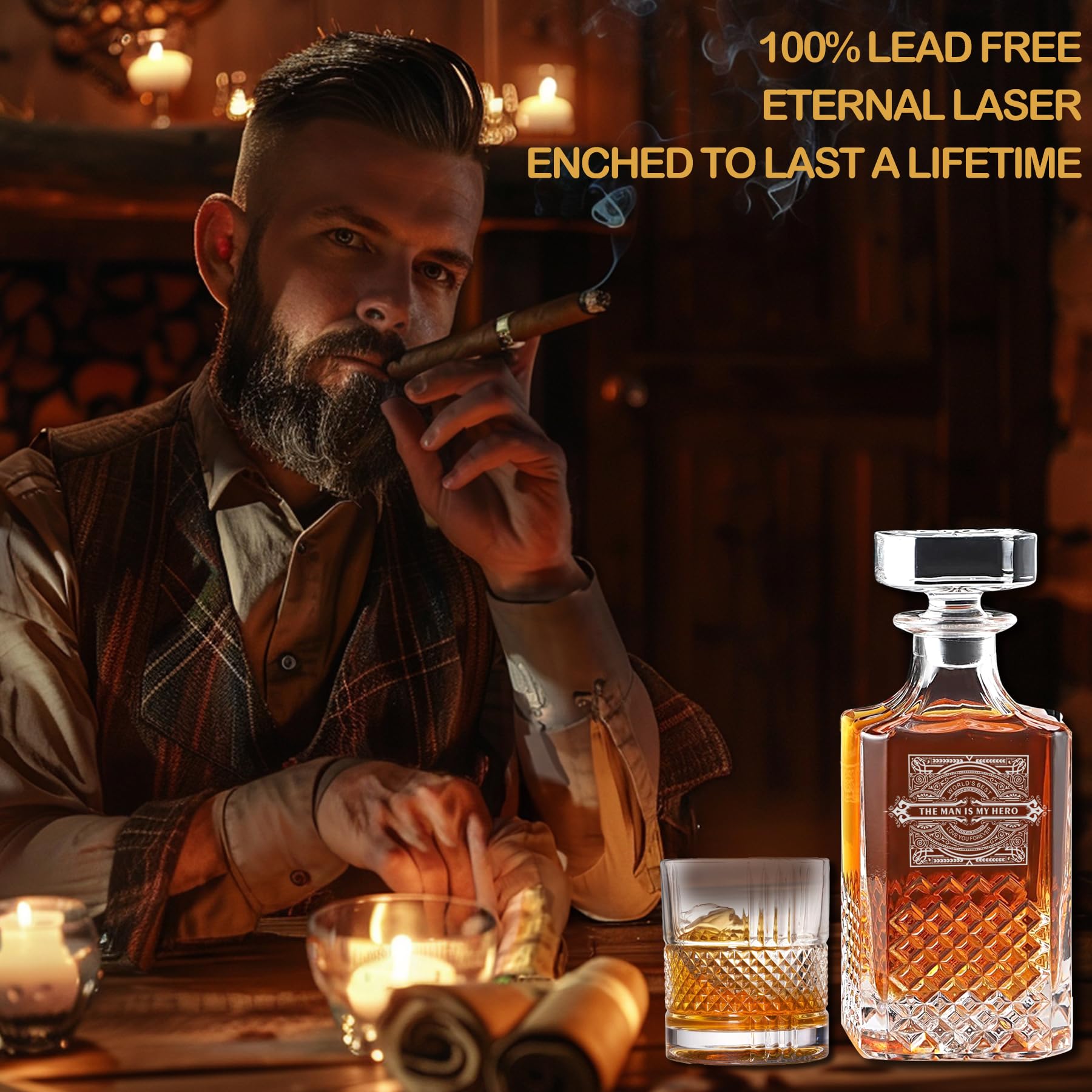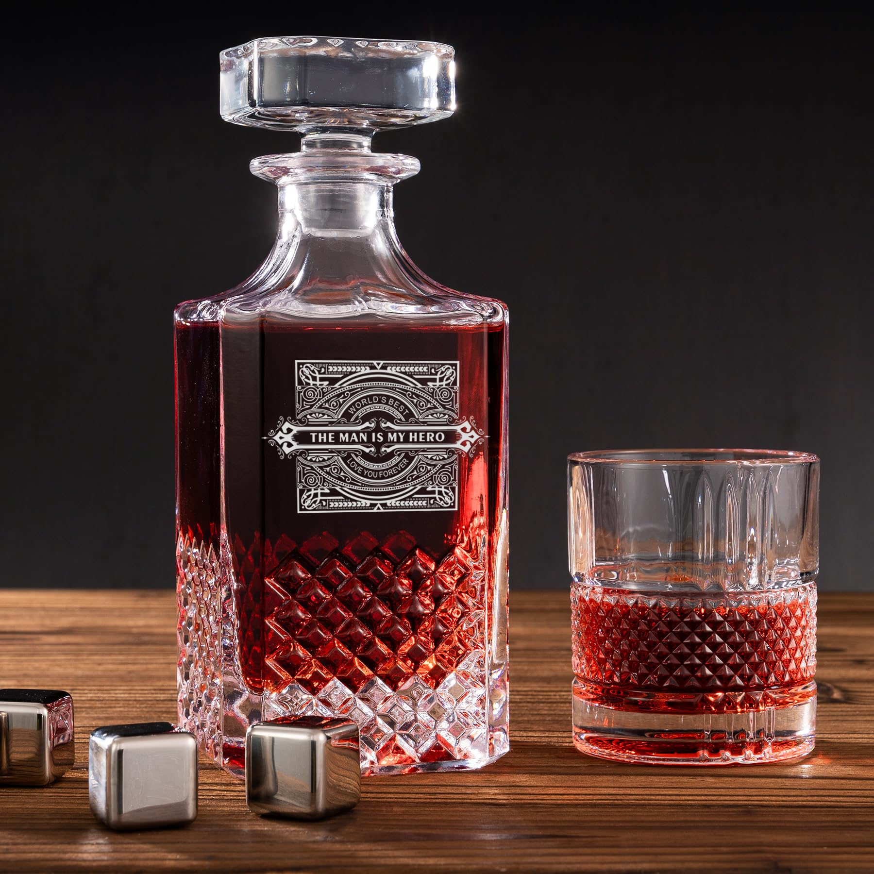 - 【Decanter Sets for Men】Old fashioned whiskey decanter gifts for men dad to impress your family and friends. What is particularly special is that the decanter surface is engraved with the words "the man is my hero" through laser. It is suitable as a meaningful gift for the heroic man in your heart, whether it is a father, husband Groomsmen or friend. Can deeply express your respect and love for them.