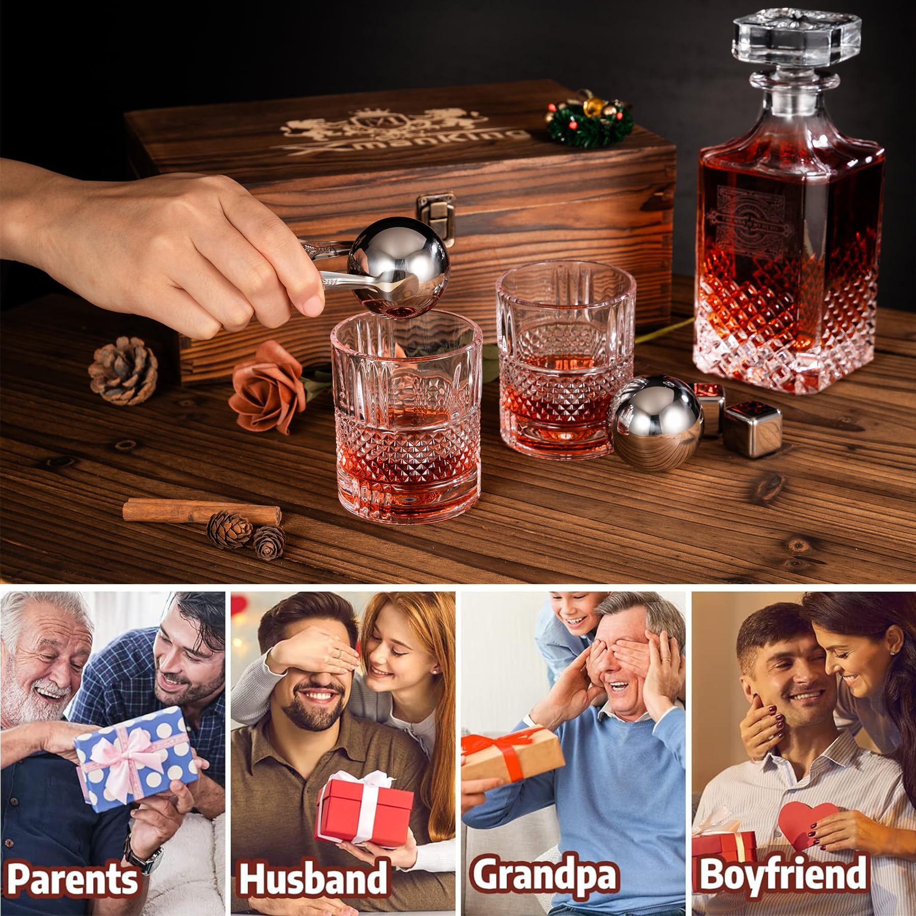 - 【Whiskey Decanter】This whisky decanter sets for men lover's gift set includes a whisky decanter, 2 whisky glasses, 2 extra large stainless steel whisky balls, ice cube holder and an elegant wooden memory gift box to enjoy your favorite drink without diluting it with ice. great gifts for dad. bourbon gifts for men husband