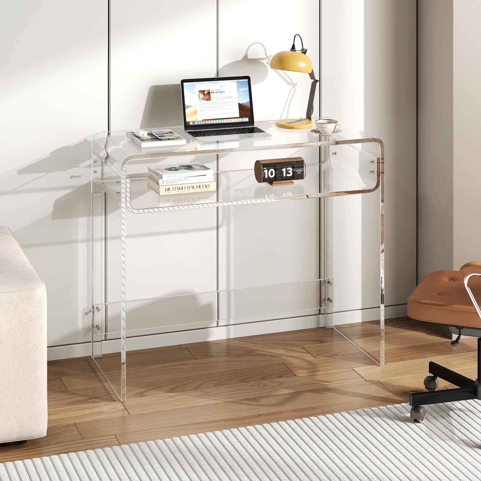 XOHYW Acrylic Office Desk, Modern Laptop Writing Study Table with Open Storage, Transparent Console Table Entryway Table, 33.5" L x 15.8" W x 29.5" H, for Home, Bedroom (Clear)
