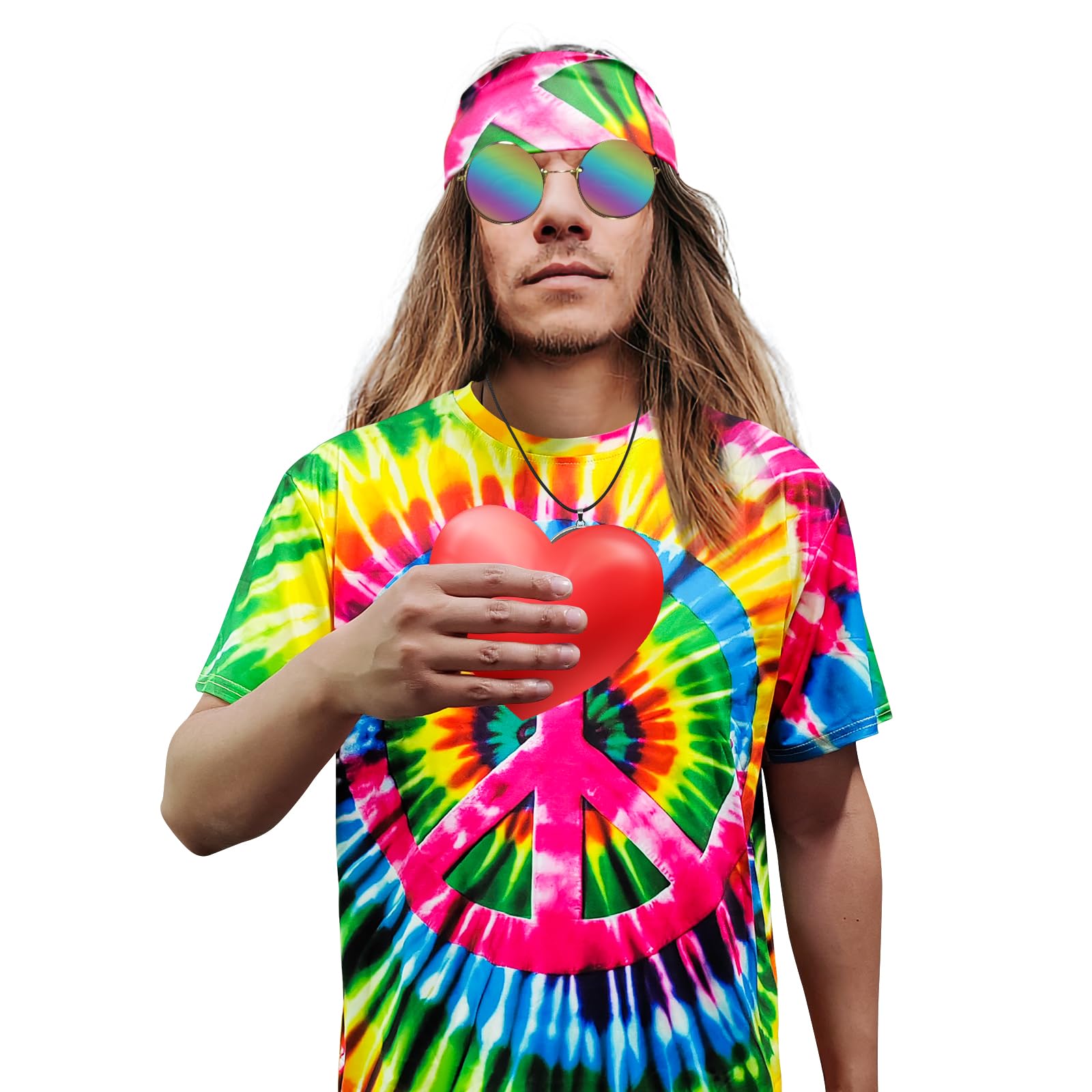 XonyiCos Hippie Costume for Men Women 60s and 70s colorful T-shirt sunglasses headband Peace necklace 4-piece theme party (Peace colorful 4-piece Set, X-Large)