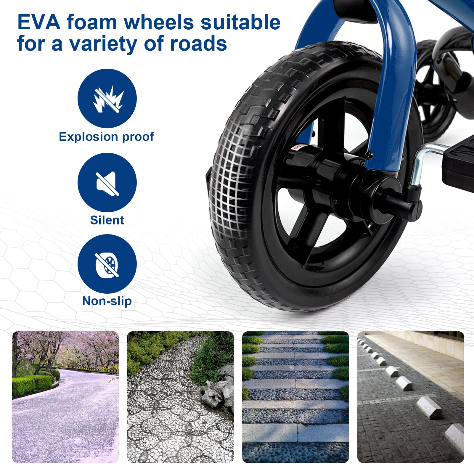 - 🎊Sturdy and Durable: Made of durable carbon steel, this tricycle ensures stability and high quality. The puncture-resistant EVA wheels do not require inflation and won’t scratch or damage floors. The tricycle can handle various outdoor terrains. It also features non-slip rubber handle grips for added comfort.