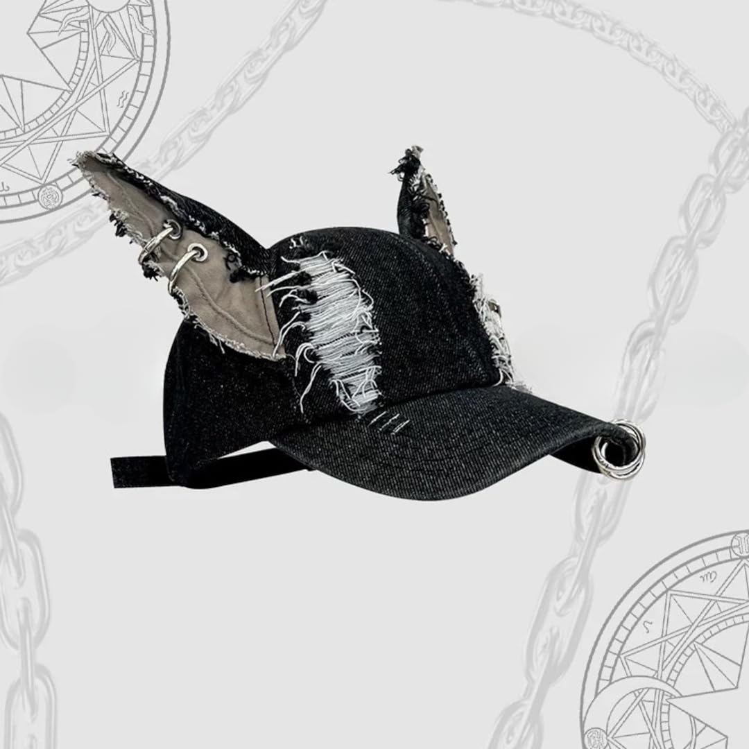 - Unique Y2K Wasteland Design: This baseball cap stands out with its distressed denim fabric, eye-catching metal rings, and edgy ripped detailing. The 3D ears add a playful touch, making it a must-have accessory for those who love to express their individuality with bold fashion statements.