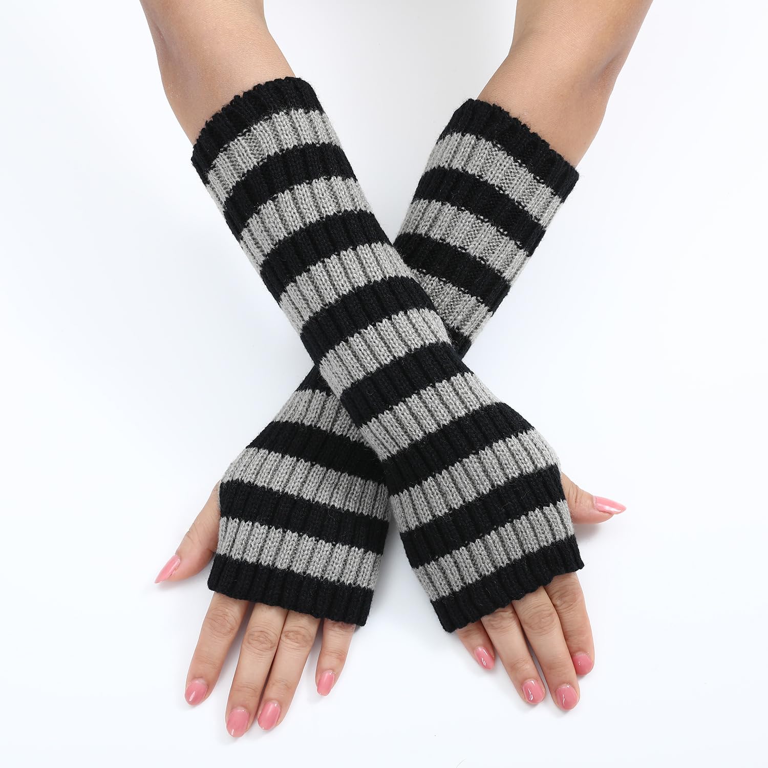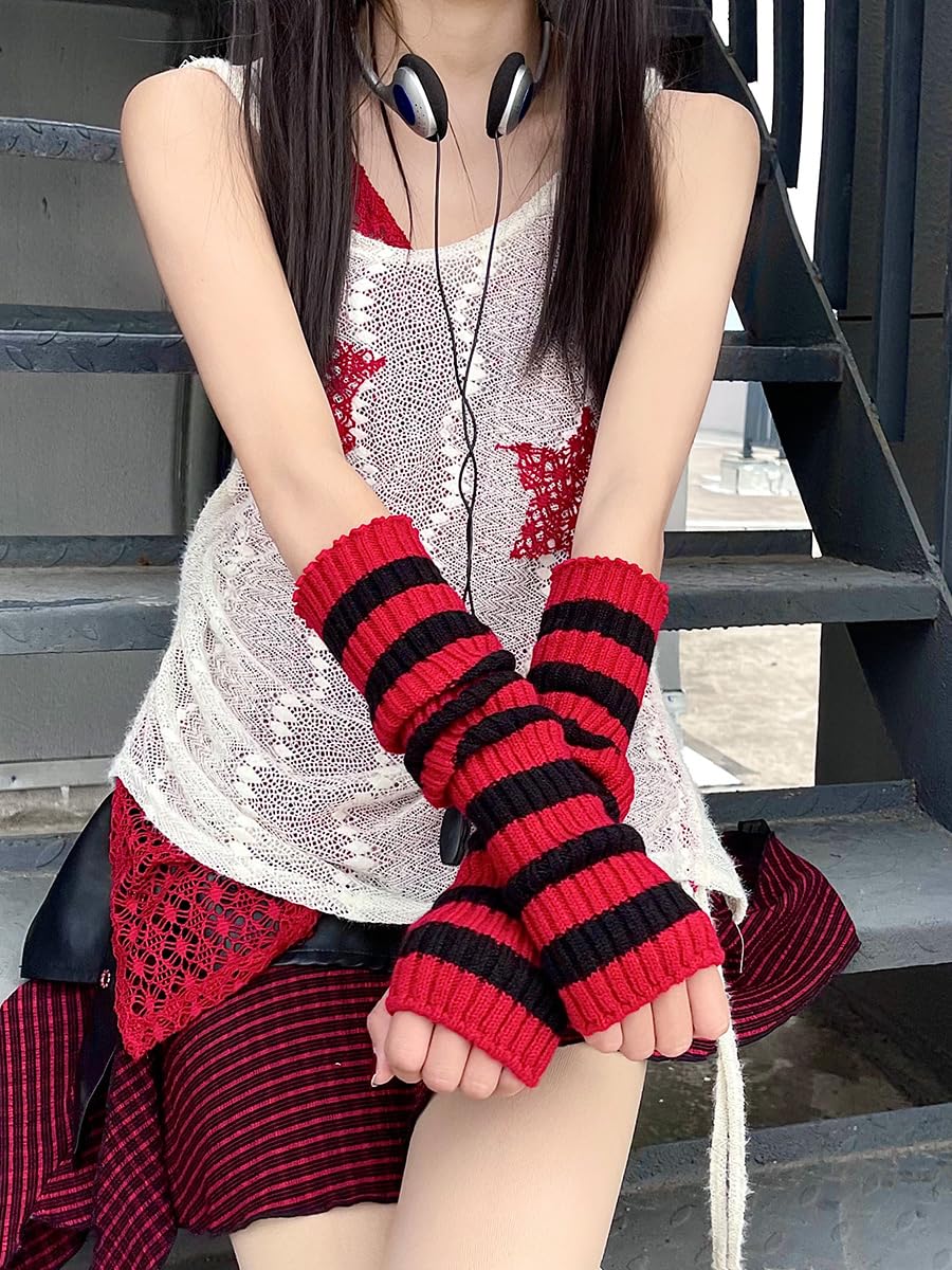 Y2k Striped Arm Warmers Long Fingerless Knitted Gloves Punk Gothic Alt Emo Scene Cool Winter Arm Sleeves Grunge Accessories (Gray,One Size)