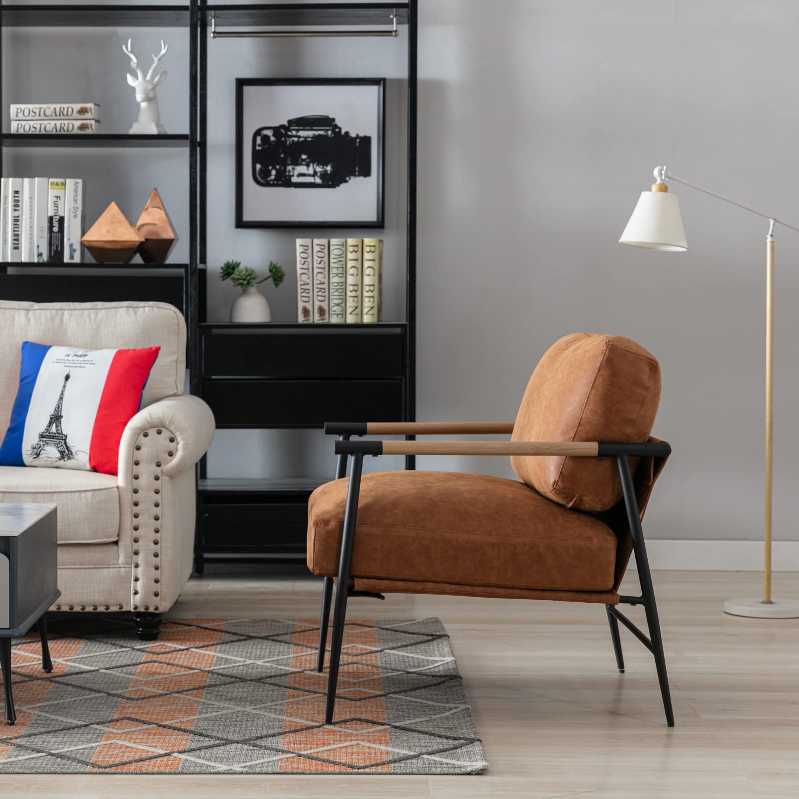 Ya-Home Mid-Century Accent Chair, Soft Armchair PU Leather Lounge Chair with Black Metal Legs, Upholstered Leisure Chair for Living Room Bedroom Reception Room, 1PC, Brown