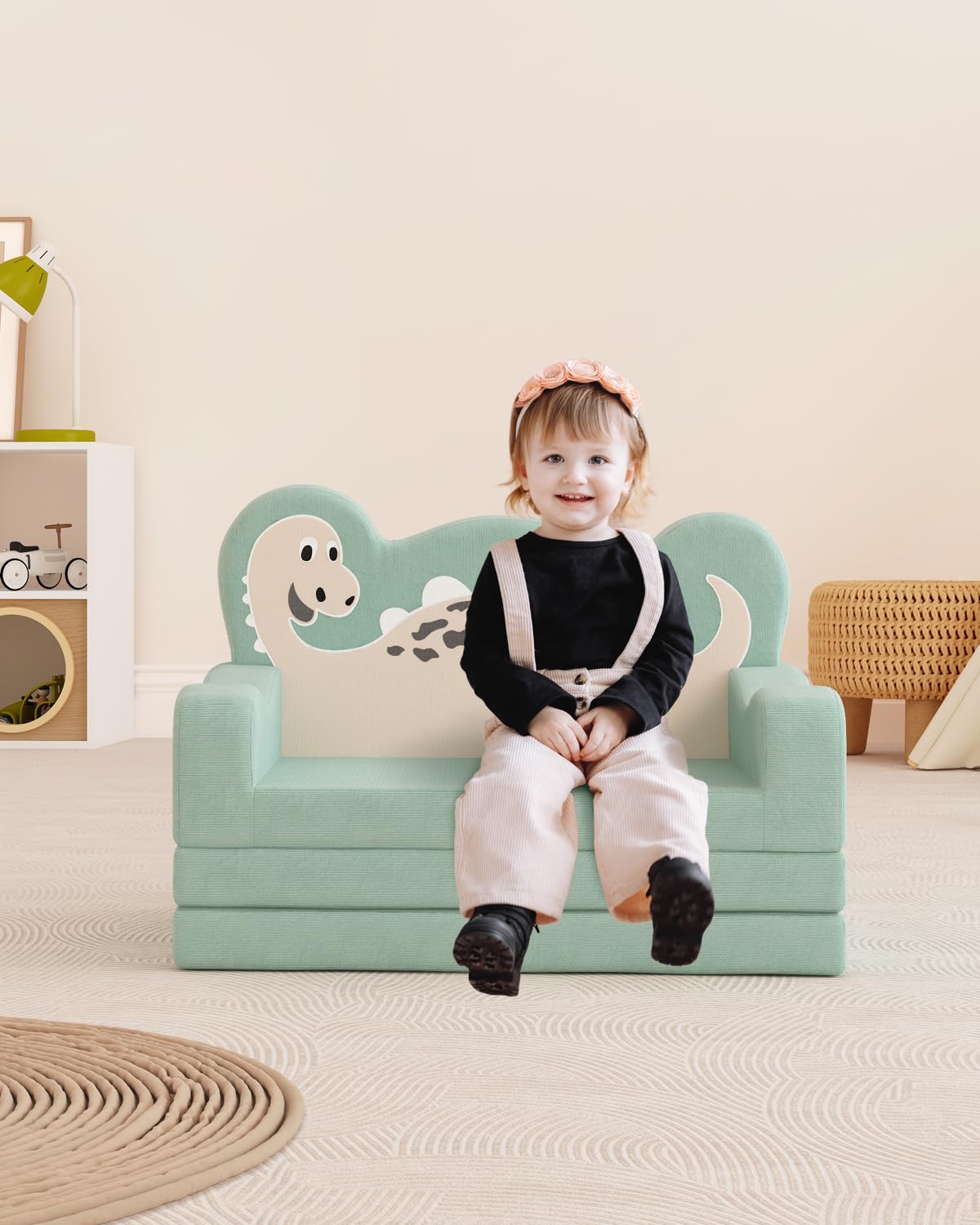 YACODAVO 2-in-1 Kids Couch Fold Out, Convertible Toddler Couch to Lounger, Toddler Chair Comfy, Kids Sofa for Girls and Boys, Gift for Birthday, Children's Day, Dinosaur Green