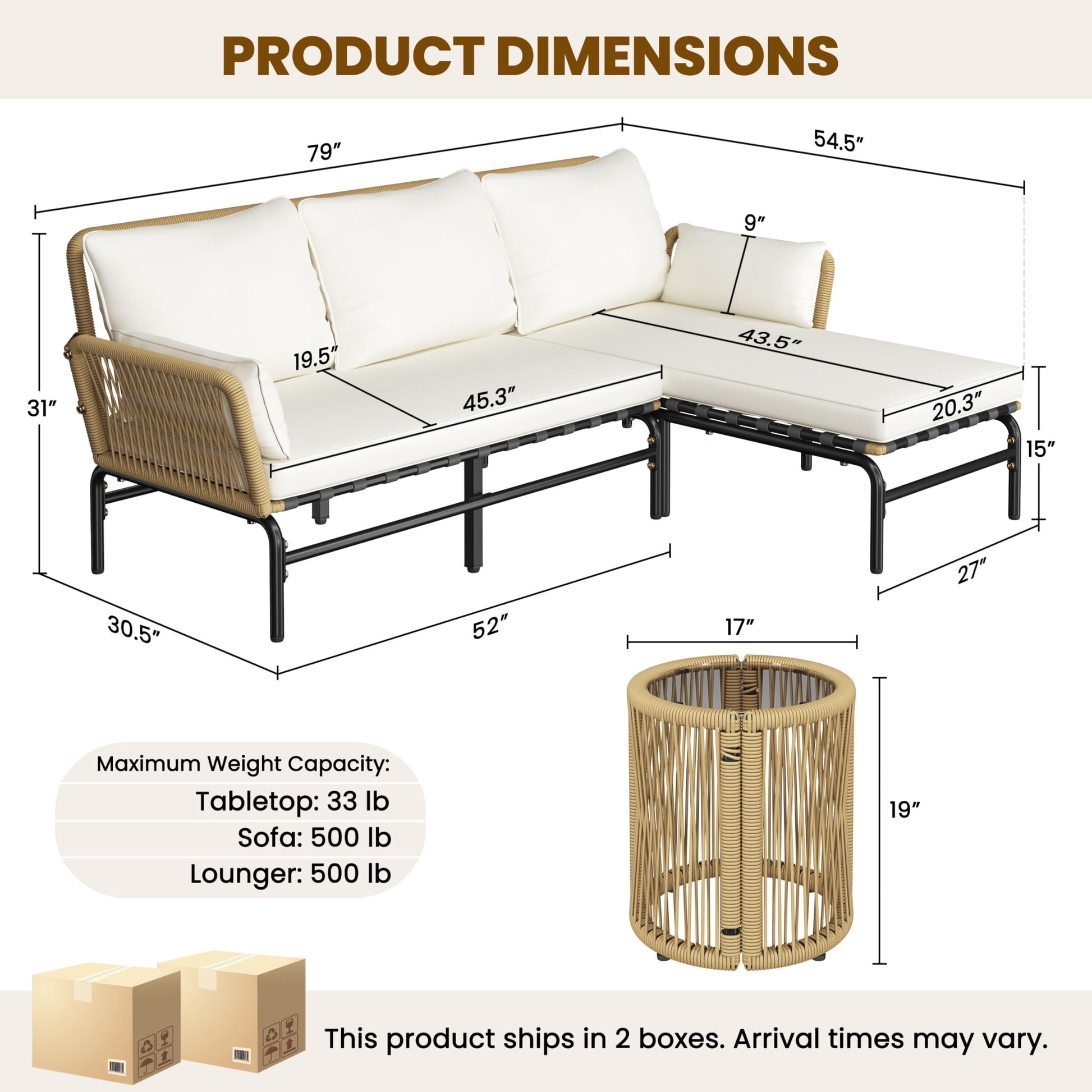 Details: This three-piece wicker furniture set includes a sofa, a lounger, and a coffee table, complete with cushions and pillows for ultimate comfort. Designed for outdoor relaxation, the set offers flexible arrangements—whether as individual pieces or combining the lounger and sofa into a larger L-shaped sofa. The thick, foam-filled cushions and pillows provide support for your arms and back. With its Bohemian design and handwoven PE rattan, the set adds a vintage yet stylish charm to any garden or patio. Weather-resistant and UV-resistant, the furniture is built to withstand outdoor elements, while the sturdy metal frame ensures long-lasting durability. Easy to maintain, the cushions have removable, washable covers, and the water-resistant material makes it ideal for poolside or beachside use. Adjust the foot pads for stability on uneven surfaces, ensuring a fit for any space.