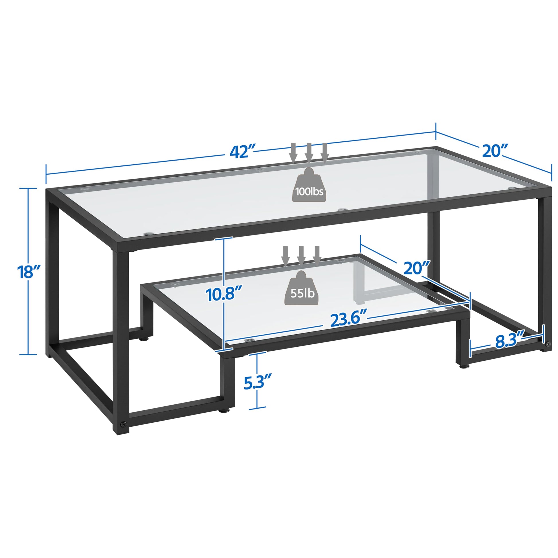 - 2-Layer Structure: This modern coffee table comprises a wide tabletop and a storage bottom shelf. The tabletop, measuring 20 × 42 inches (L×W) and bearing 99 lb, is broad enough for serving as a center table in your living room to treat friends, serve coffee or snacks