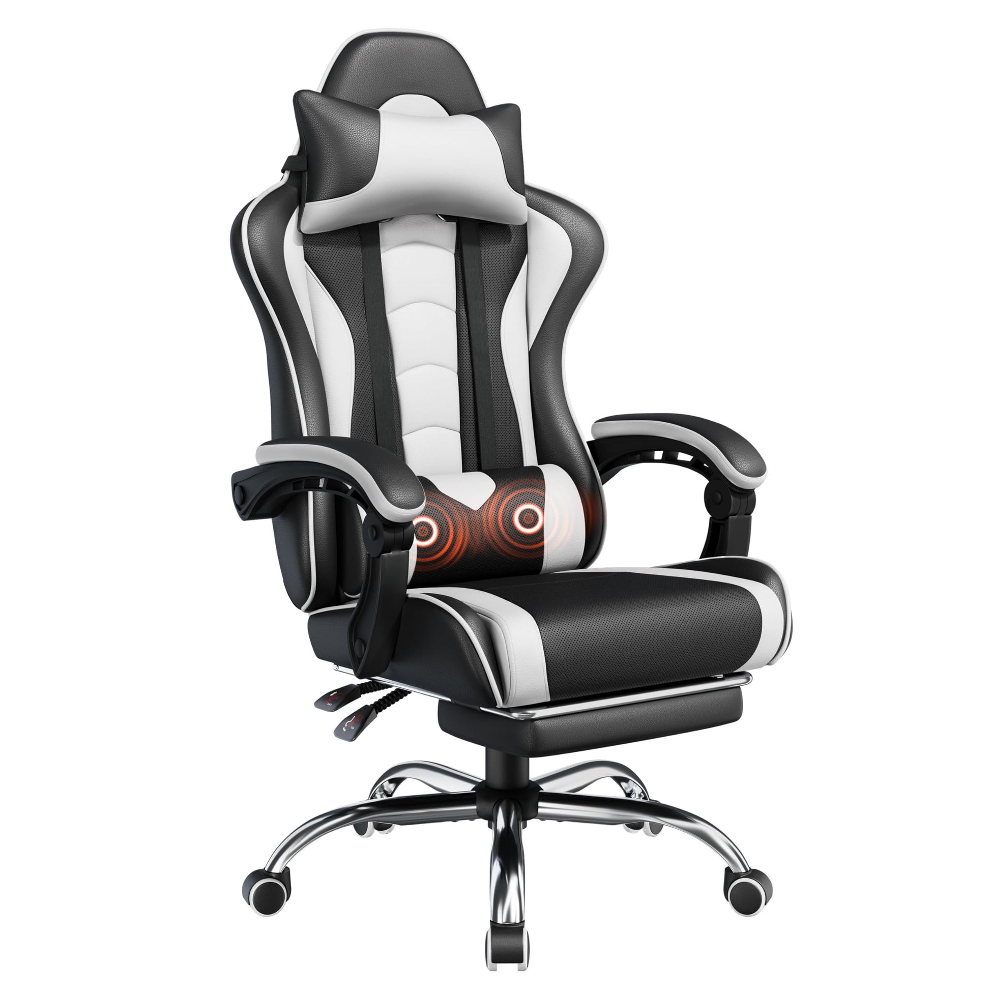 Yaheetech Gaming Chair, Video Game Chair with Massage Lumbar Support and Footrest Height Adjustable Ergonomic Computer Gaming Chair with Swivel Seat and Headrest, Black/White