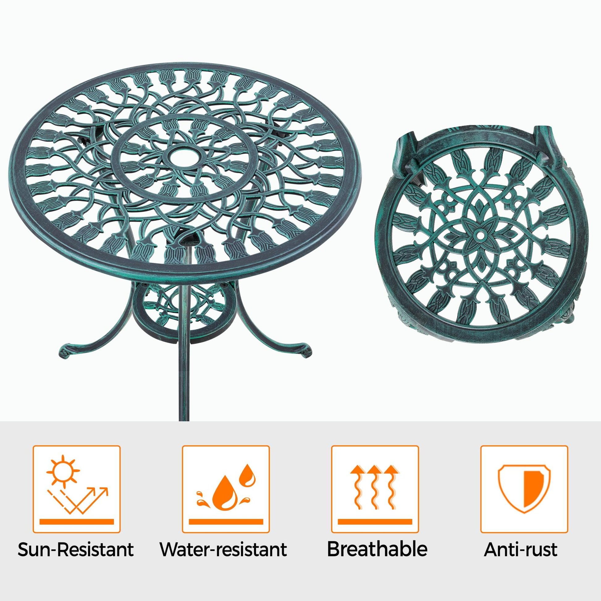 - 3-piece Bistro Set: Comprising a bistro outdoor table with an umbrella hole and a pair of dinning chairs in the same style. This stylish and classic garden set features practical functions that is capable of well serving your courtyard time