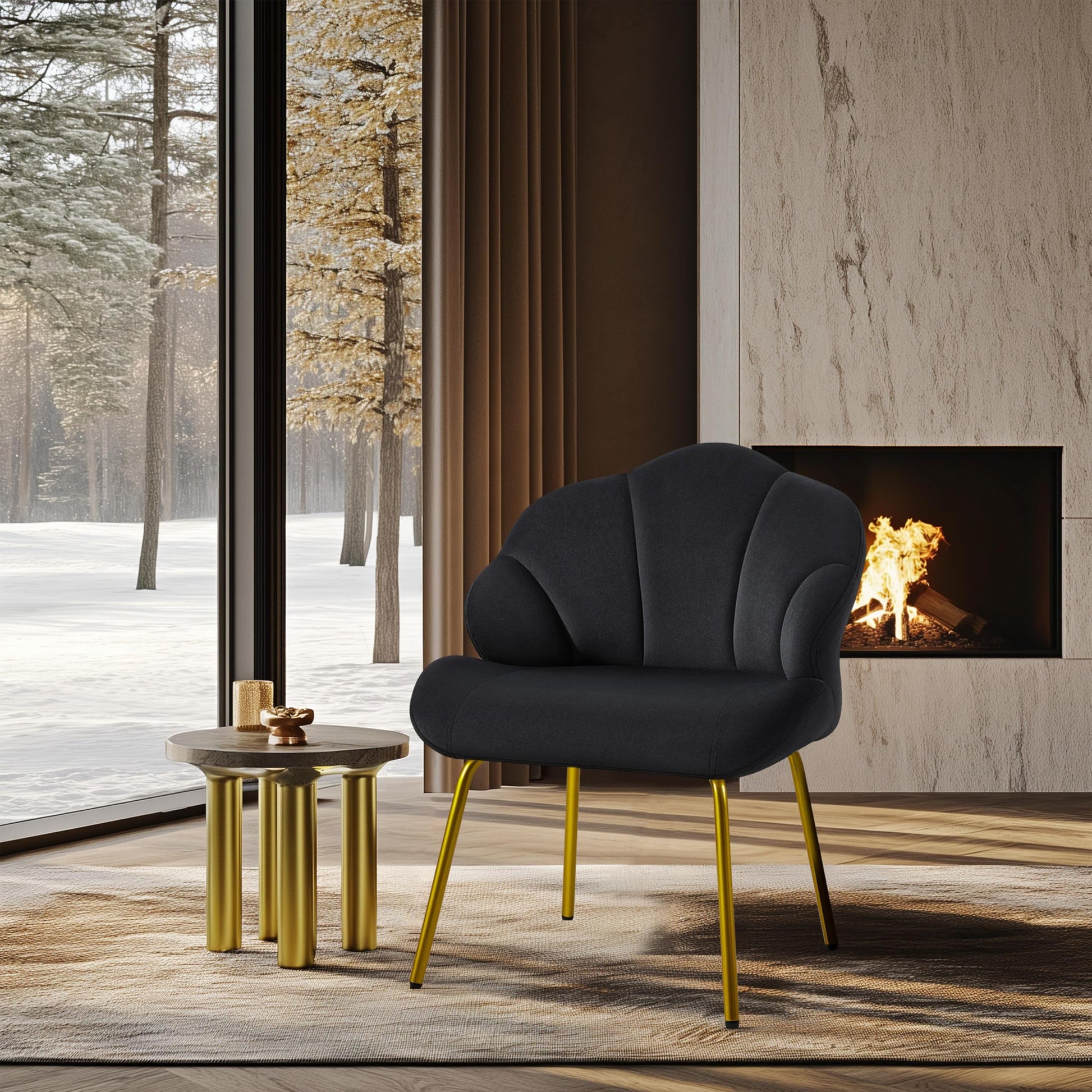 - Elegant Comfort: Experience luxury with our leisure chair featuring a gracefully contoured shell-shaped backrest adorned with channel tufting. Crafted from plush velvet-like fabric and complemented by slim golden legs, this piece effortlessly combines delicacy with modern style, making it a visually appealing addition to any space